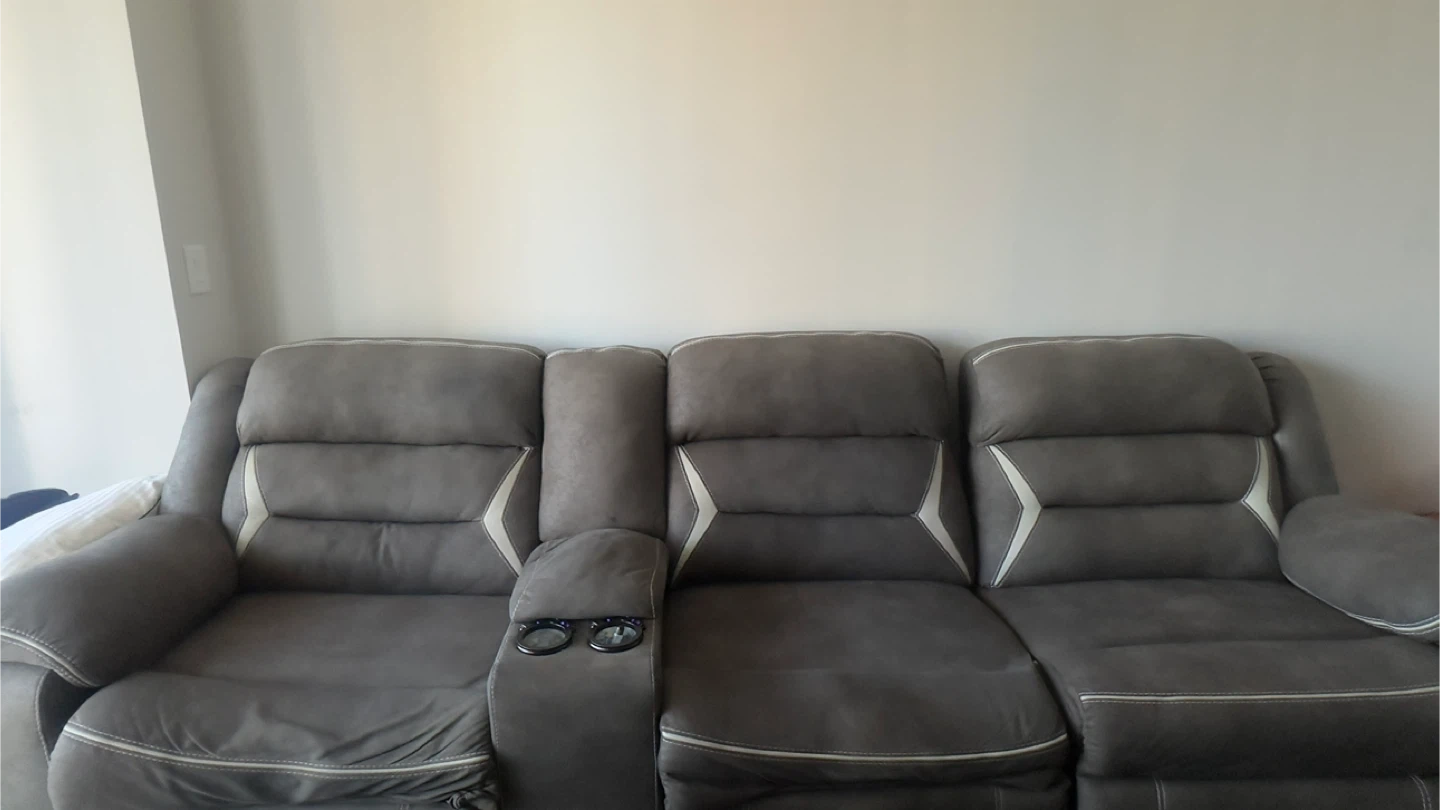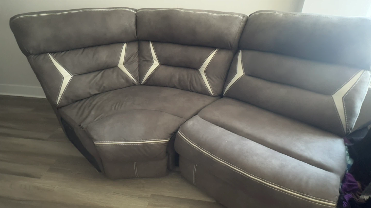 Selling a comfortable gray reclining sectional sofa. It features a modern design with white accents and built-in cup holders. Perfect for a living room or home theater setup!