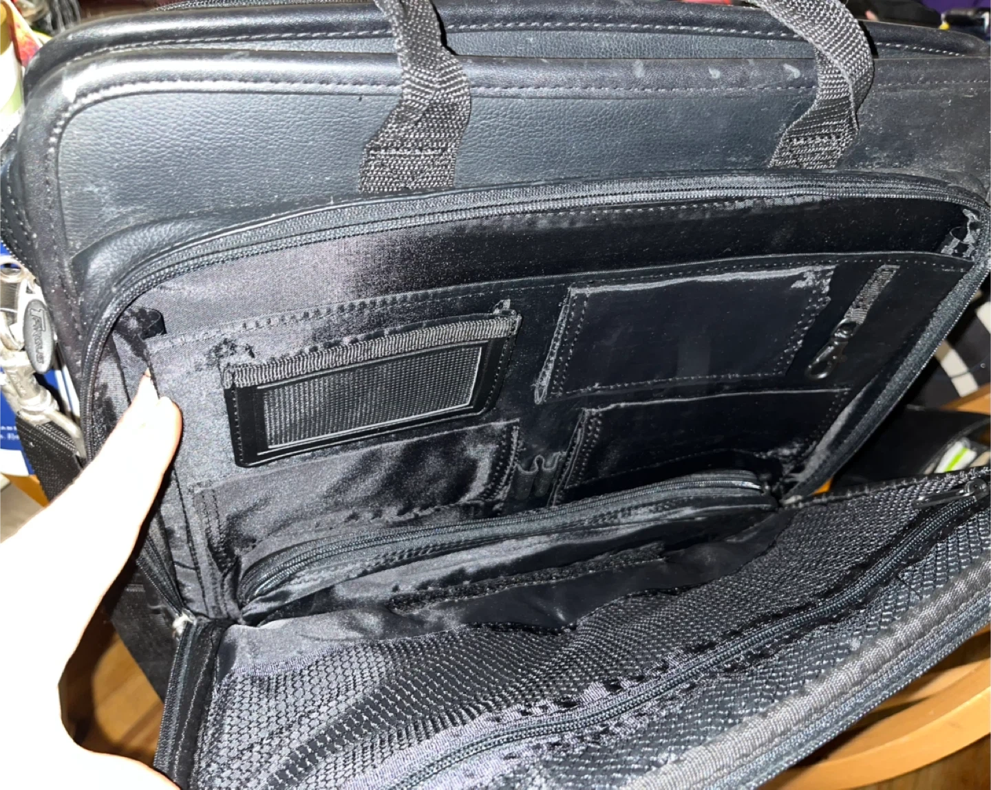 This Targus laptop bag is black with a faux leather exterior. It features multiple compartments inside and outside for organization. It's great for carrying your laptop and work essentials on the go!