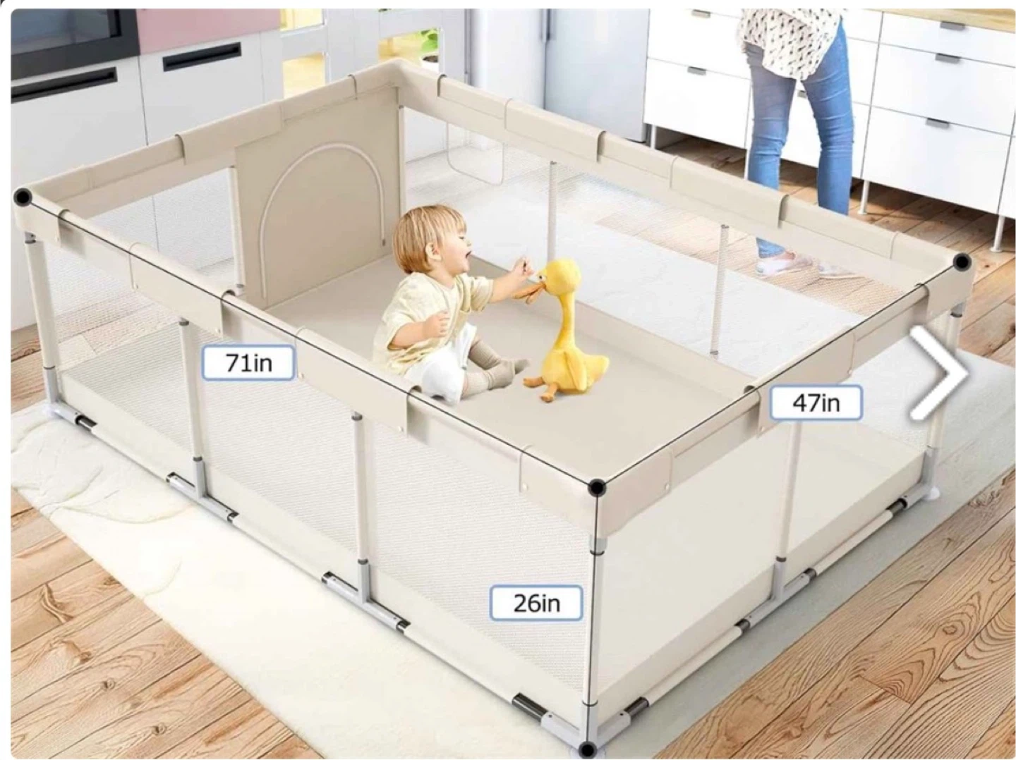 This new open box playpen offers a safe space for little ones to play. It's designed with mesh sides for visibility and easy assembly. Dimensions are 71 inches by 47 inches, with a height of 26 inches.