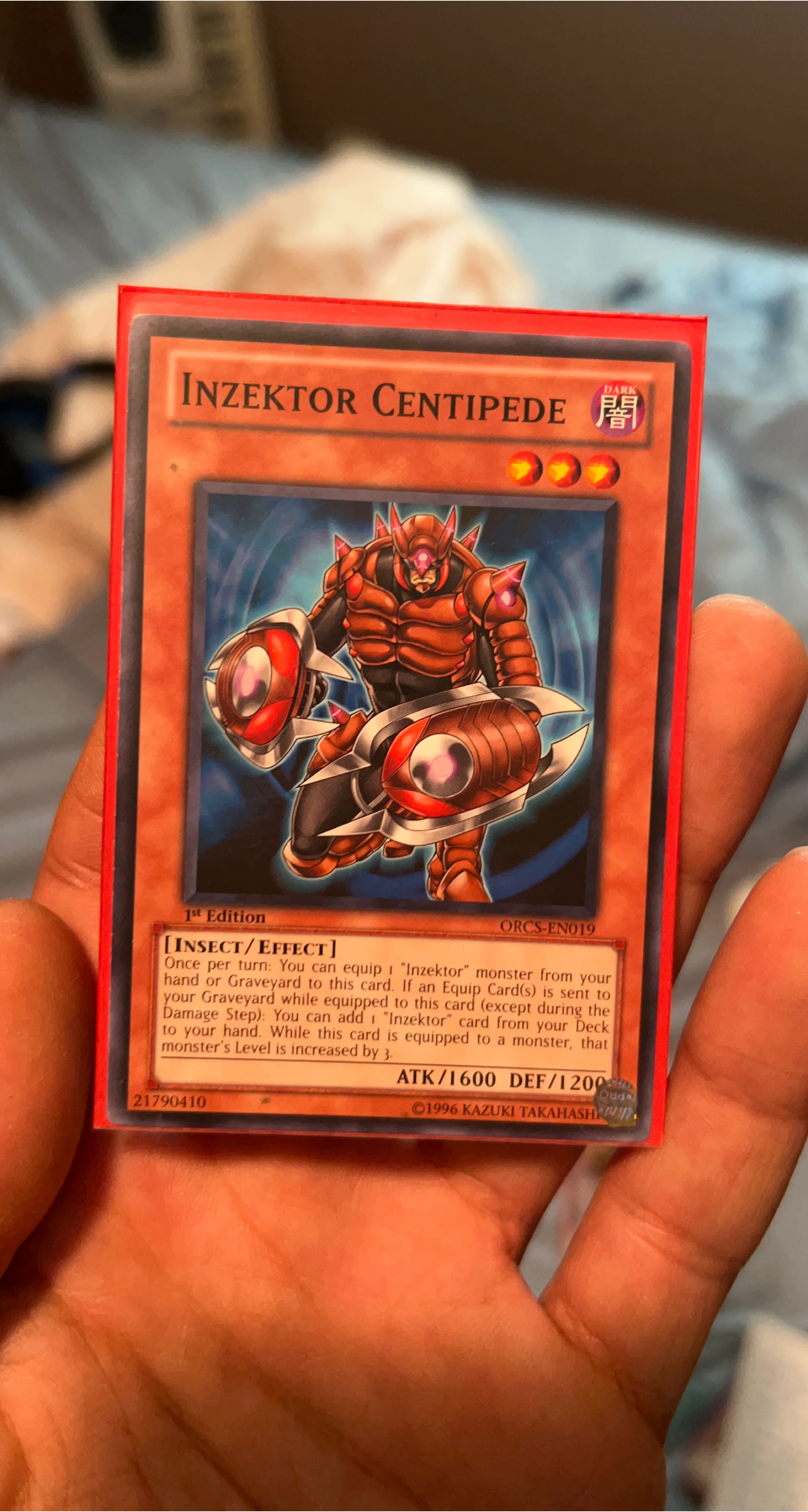 Selling an Inzektor Centipede Yu-Gi-Oh! card. It's a 1st Edition Insect/Effect monster card with 1600 ATK and 1200 DEF. A great addition to any Yu-Gi-Oh! collection!