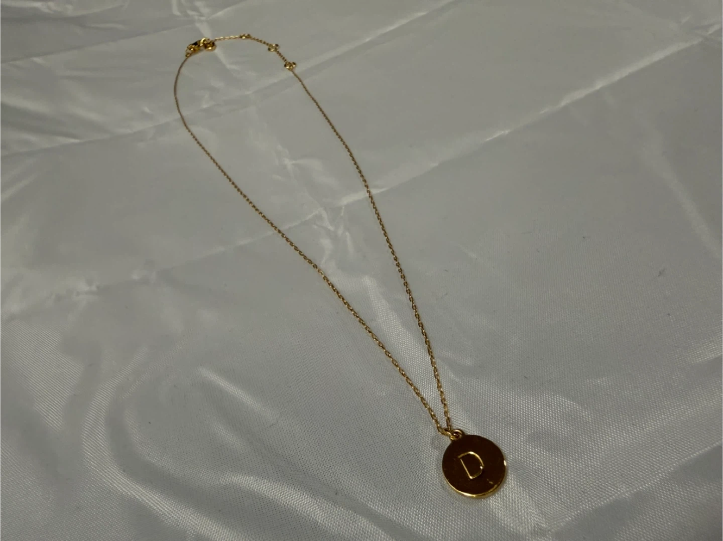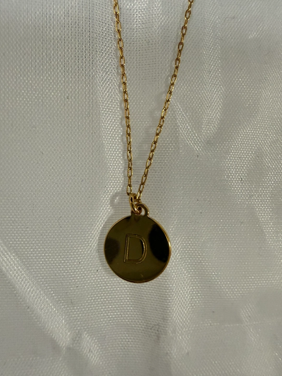 This delicate gold chain necklace features a circular pendant engraved with the letter "D". The chain is adjustable for a customized fit. It's a simple and elegant accessory.