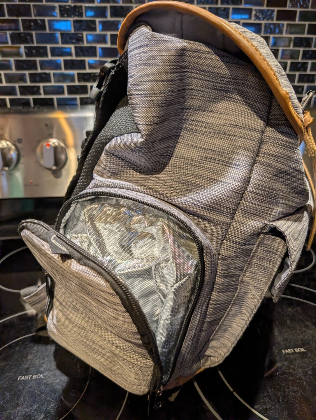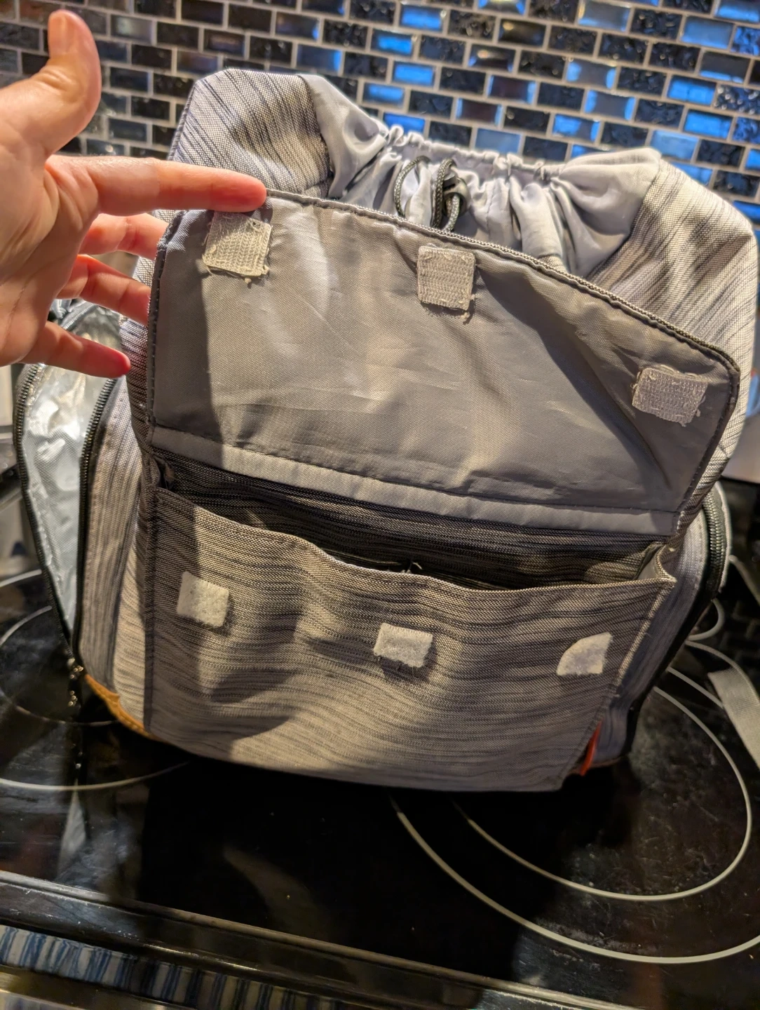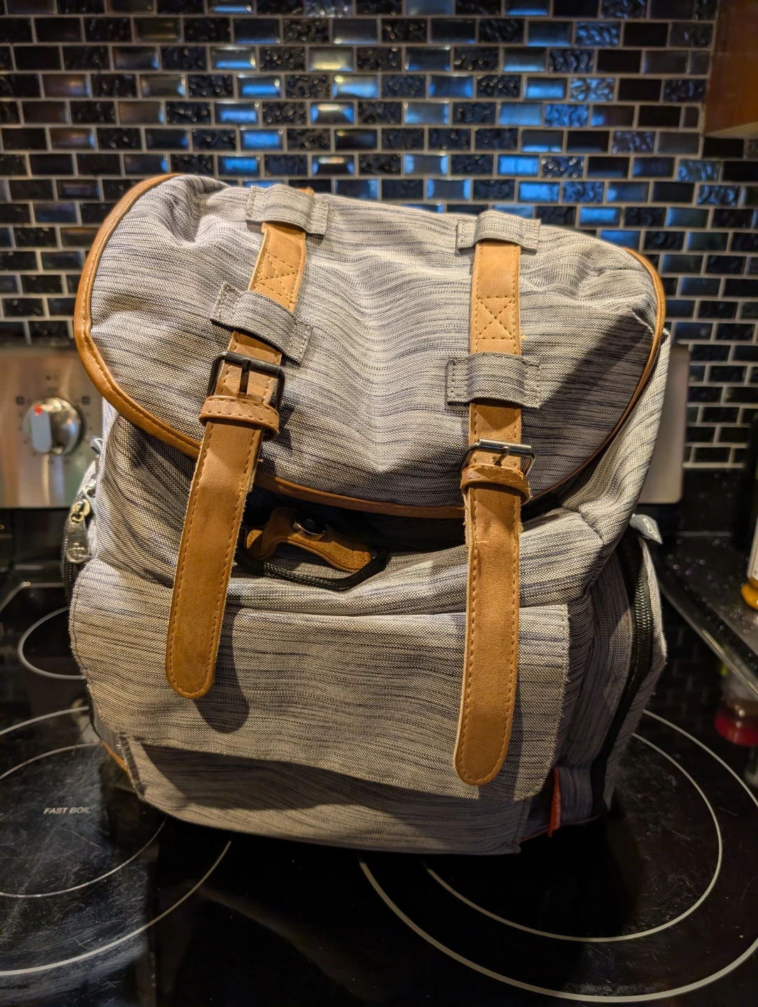 Grey striped Fisher Price diaper bag backpack with faux leather accents. It's got a large main compartment with a drawstring closure, and multiple exterior pockets. Includes a small padded water-resistant diaper pad in the main compartment. Has one thermal side pocket for milk, and one wipes side pocket. This bag is suitable for everyday use or short trips. It has clips on the straps to attach to a stroller handle. The bag has wear and tear: a small tear in an organizer inside the front pocket, and the metal drawstring stopper has detached from the fabric material, though you can still close the main compartment without issues. It still has lots of life and is mostly in good shape.