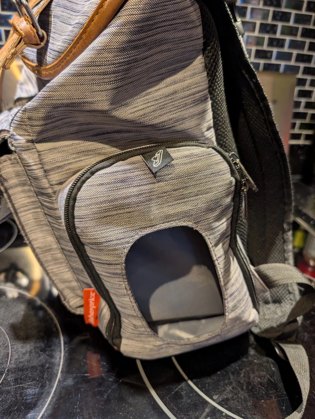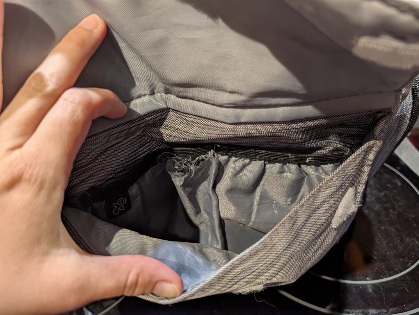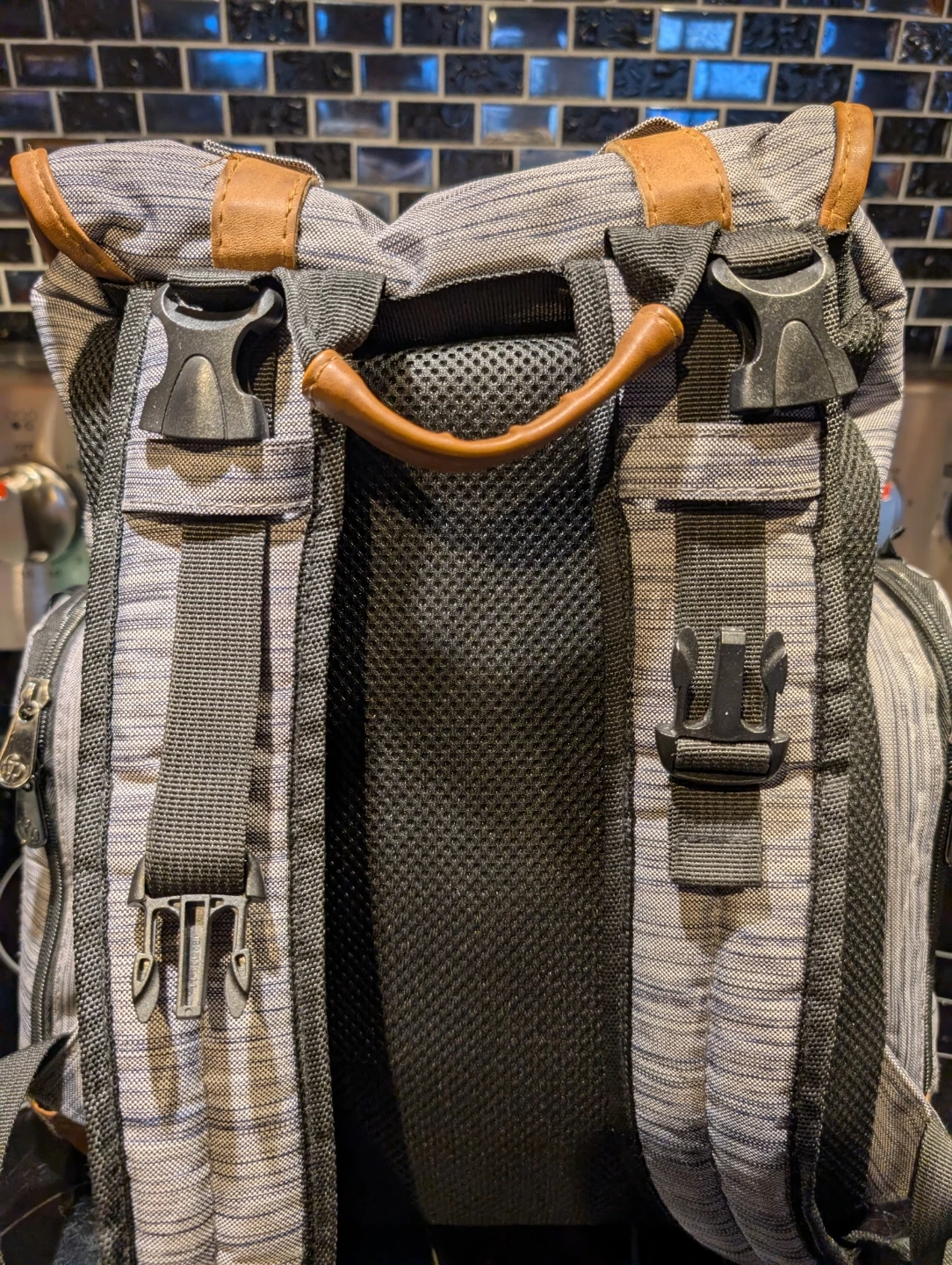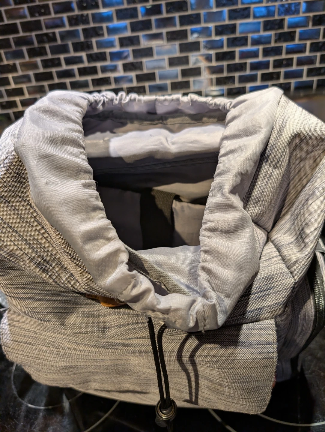 Grey striped Fisher Price diaper bag backpack with faux leather accents. It's got a large main compartment with a drawstring closure, and multiple exterior pockets. Includes a small padded water-resistant diaper pad in the main compartment. Has one thermal side pocket for milk, and one wipes side pocket. This bag is suitable for everyday use or short trips. It has clips on the straps to attach to a stroller handle. The bag has wear and tear: a small tear in an organizer inside the front pocket, and the metal drawstring stopper has detached from the fabric material, though you can still close the main compartment without issues. It still has lots of life and is mostly in good shape.
