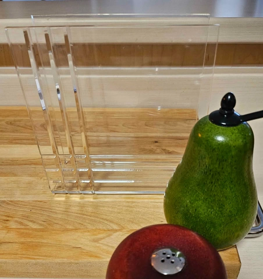 This clear lucite napkin holder from the 70s or 80s features an etched cross pattern. It's perfect for any occasion, as seeing the napkins inside helps set the mood for your gathering. This is a versatile piece that fits any decor style. Dimensions are 6" high x 5 3/4" wide x 2 1/2" at its deepest point. There are minor scratches consistent with age, but they don't detract from its appearance. The wood apple salt shaker and pear pepper grinder are being sold separately.