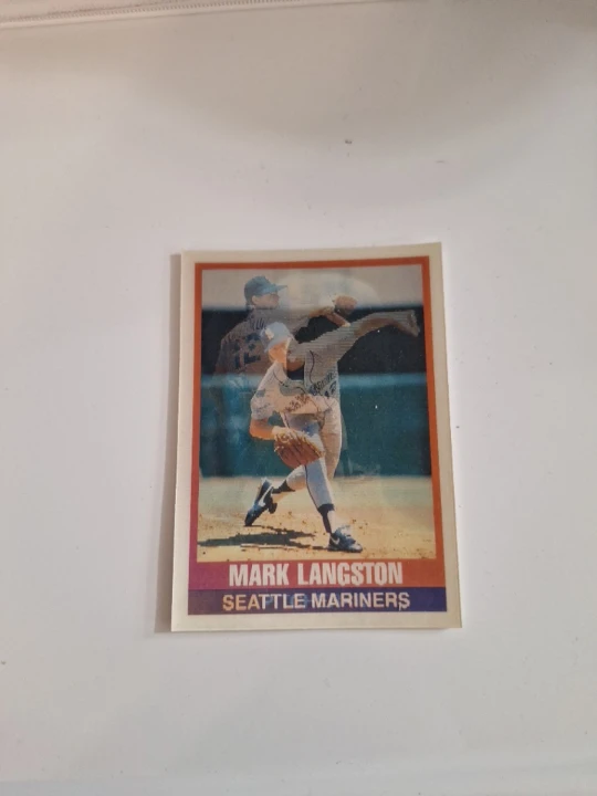 This is a baseball card featuring Mark Langston of the Seattle Mariners. It shows him in the act of pitching. A classic collectible for any baseball fan!