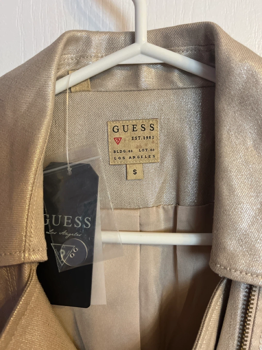 Selling a Guess metallic moto jacket in size small! It's a stylish piece with zipper details and studded shoulders. Brand new. Great for adding a bit of edge to your wardrobe.