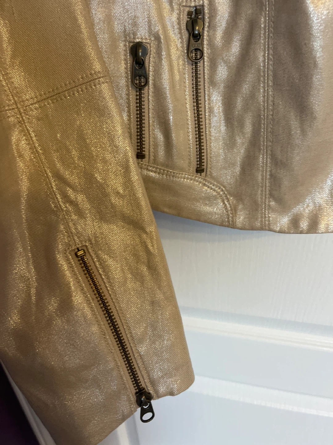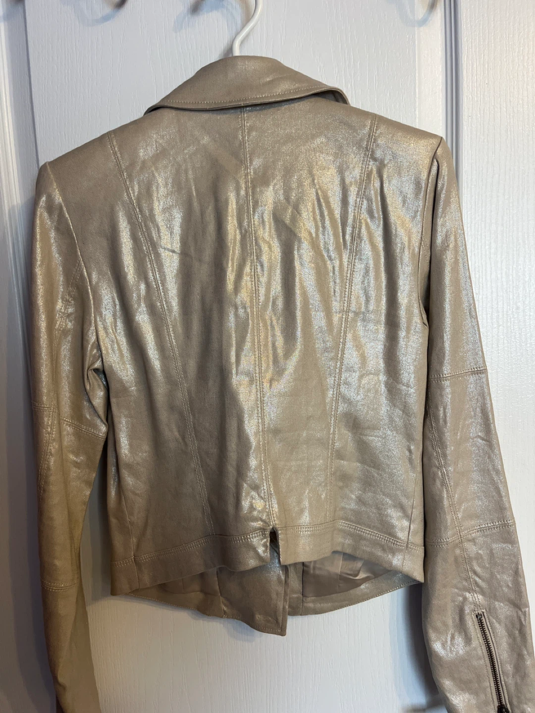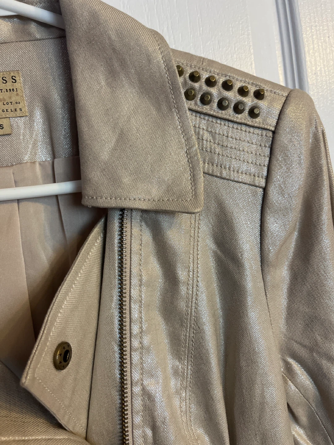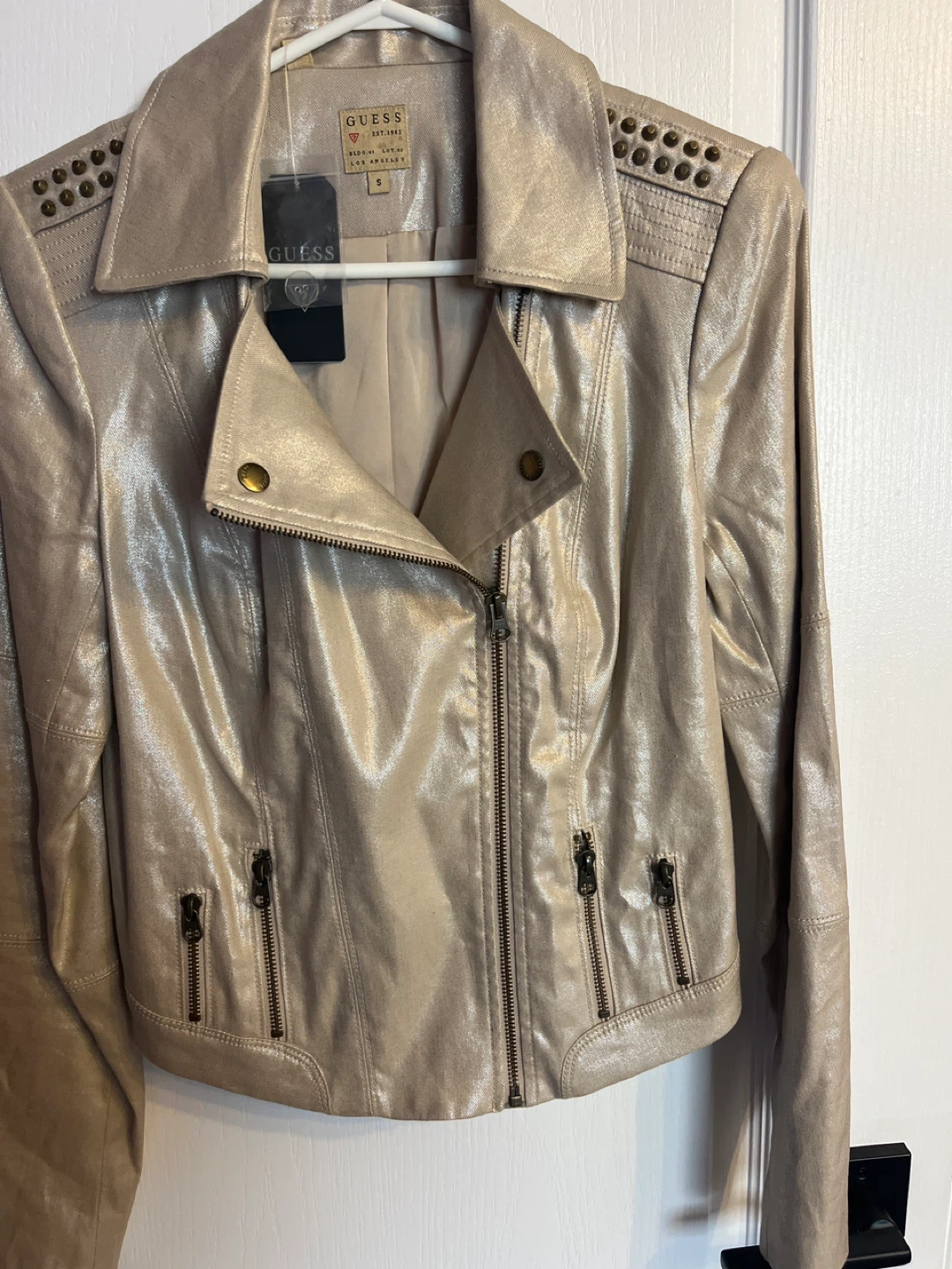 Selling a Guess metallic moto jacket in size small! It's a stylish piece with zipper details and studded shoulders. Brand new. Great for adding a bit of edge to your wardrobe.