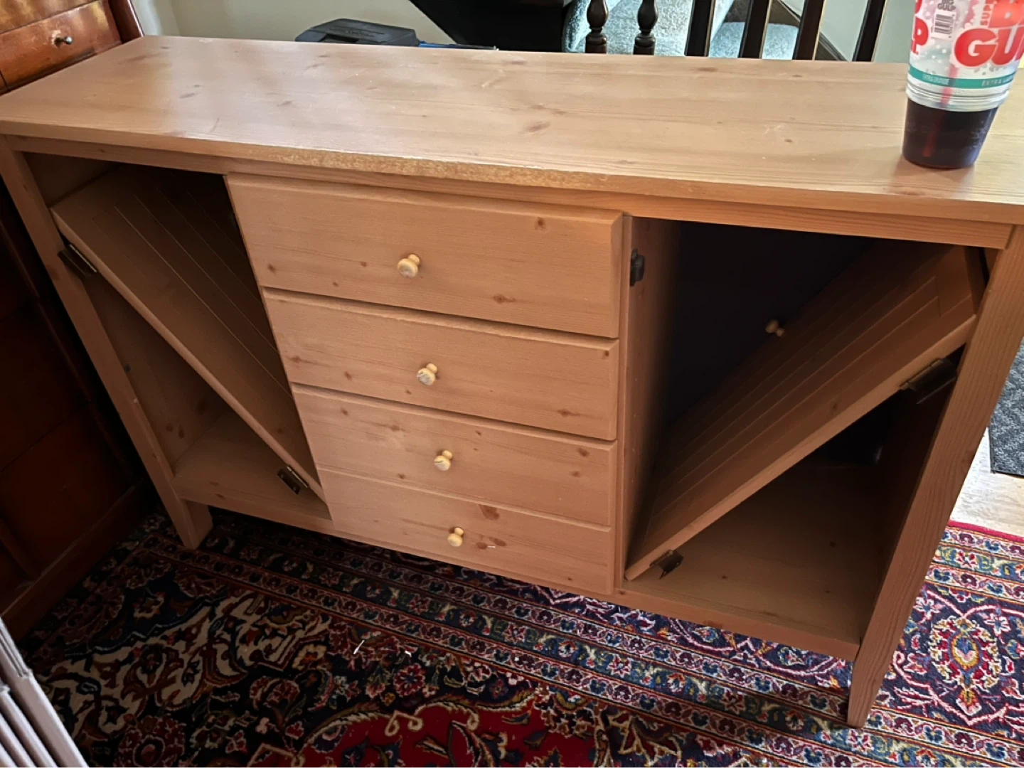 This wooden sideboard offers ample storage with its four drawers and two cabinets. It's made of light-colored wood with wooden knob handles. The cabinet doors have slatted inserts.