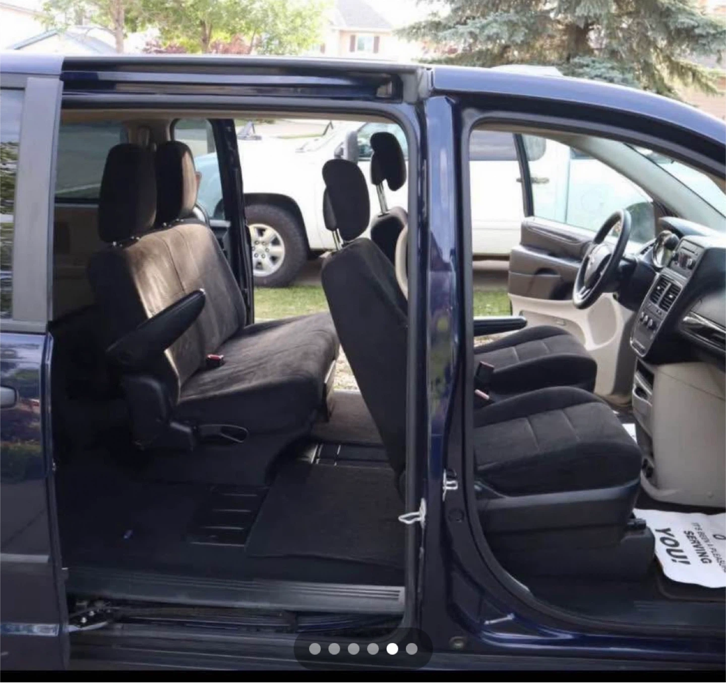 This is a Dodge Grand Caravan minivan in a deep blue colour. It's a spacious vehicle with comfortable seating for passengers. Great for family trips or hauling gear!