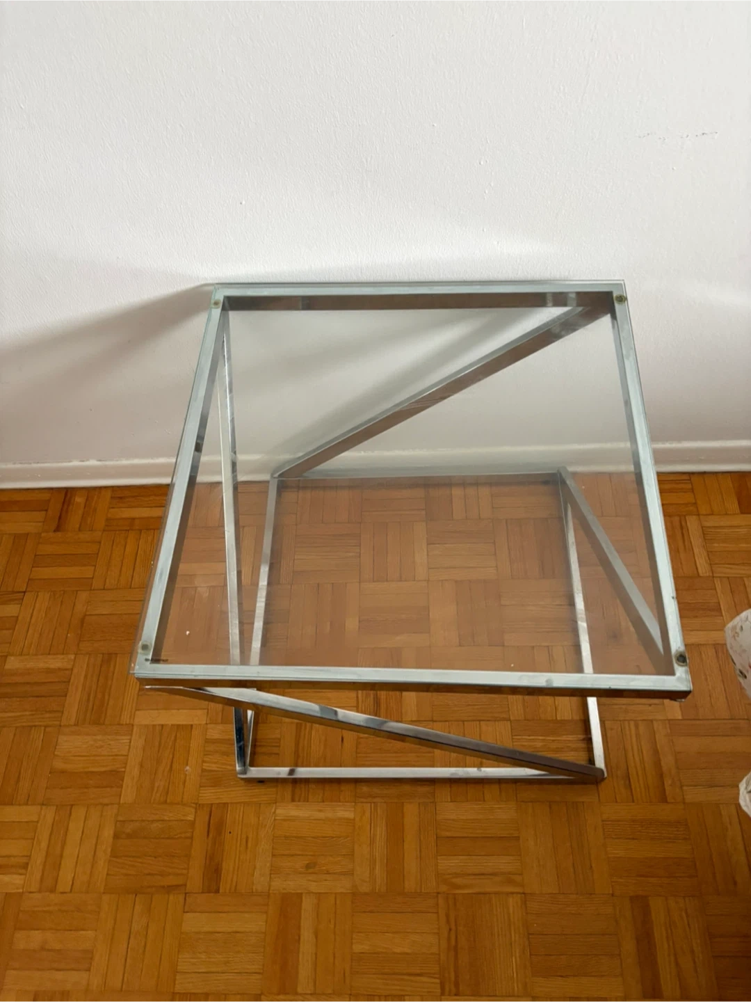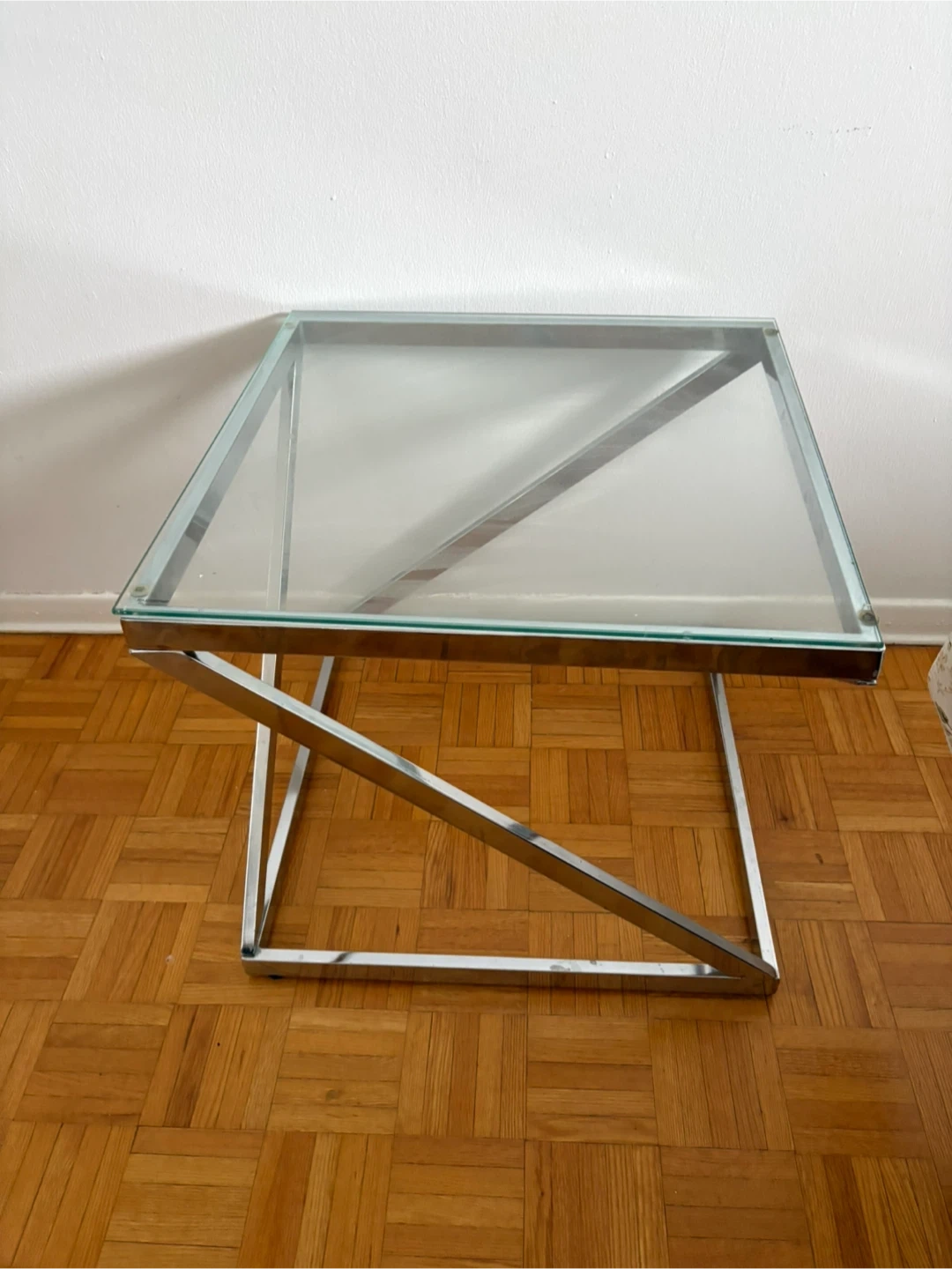 Modern end table with a clear glass top and a polished chrome base. It has a sleek, geometric design. Glass material and chrome frame.