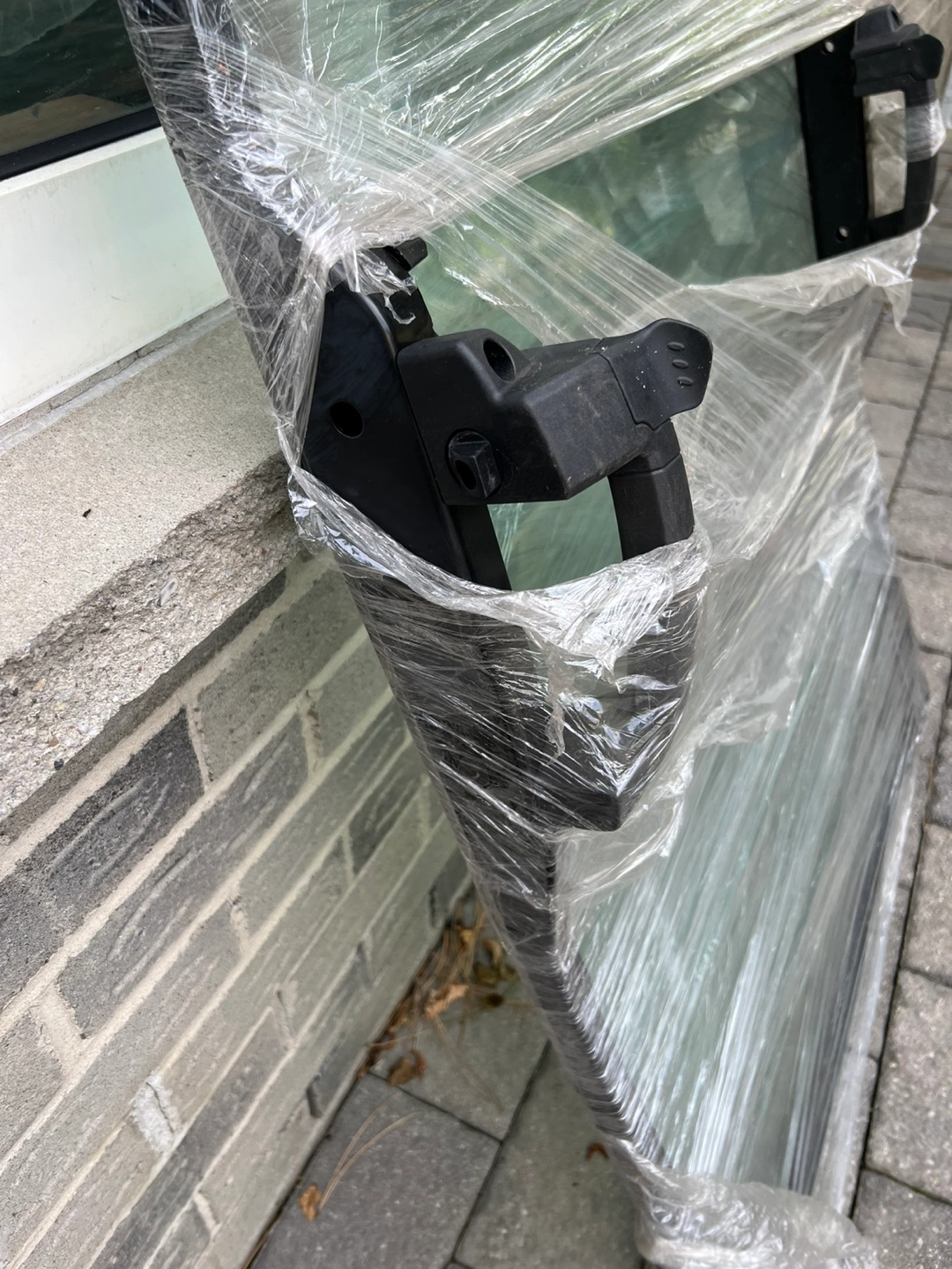 Selling a window glass with a black frame. It's currently wrapped in plastic for protection. The glass appears to be in good condition and ready for installation. Please take a look at the photos to see the details