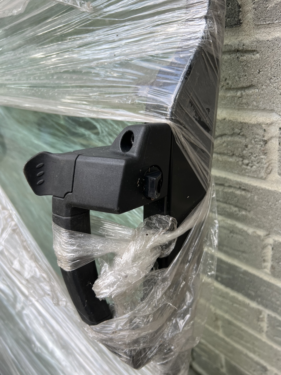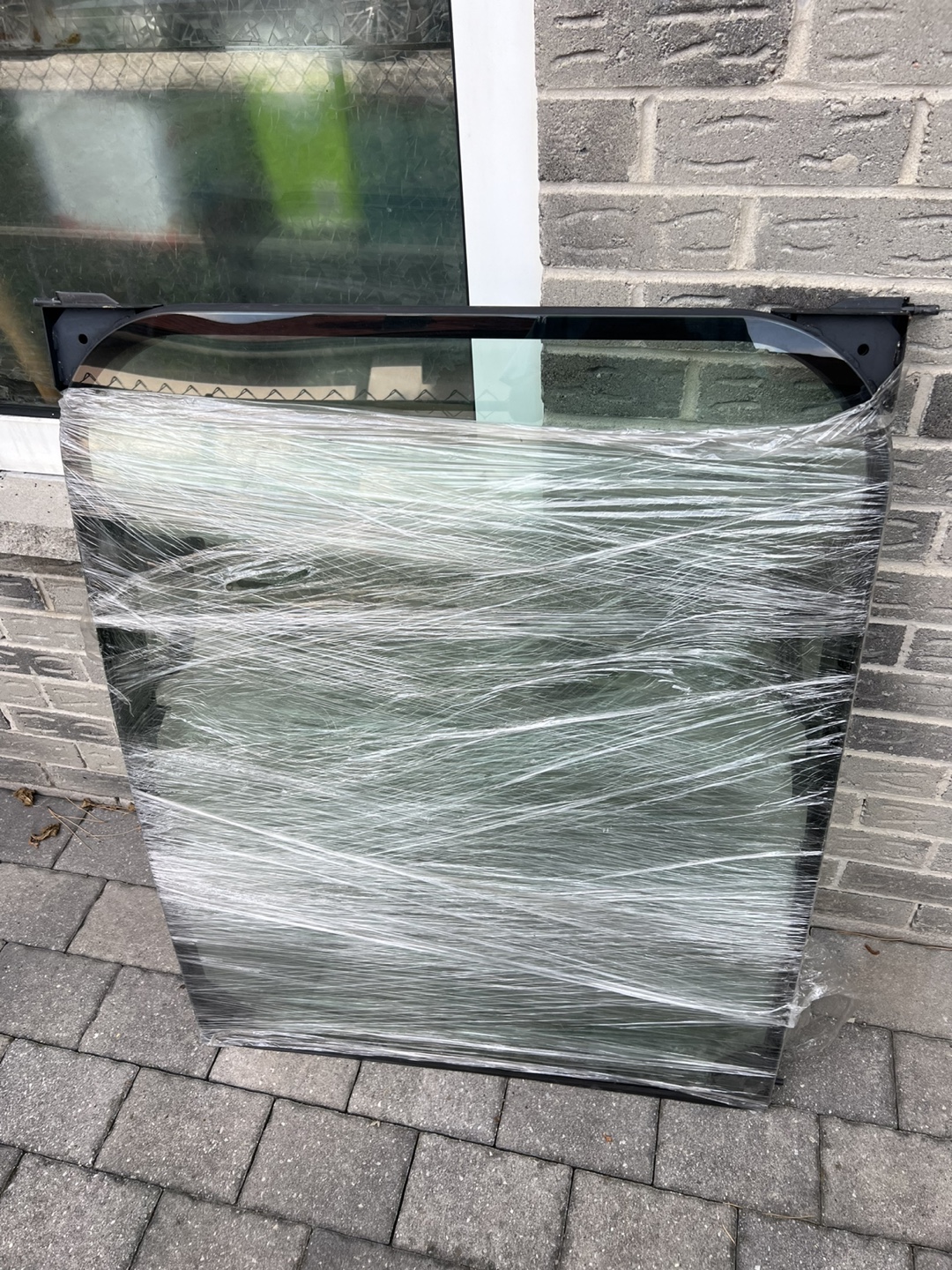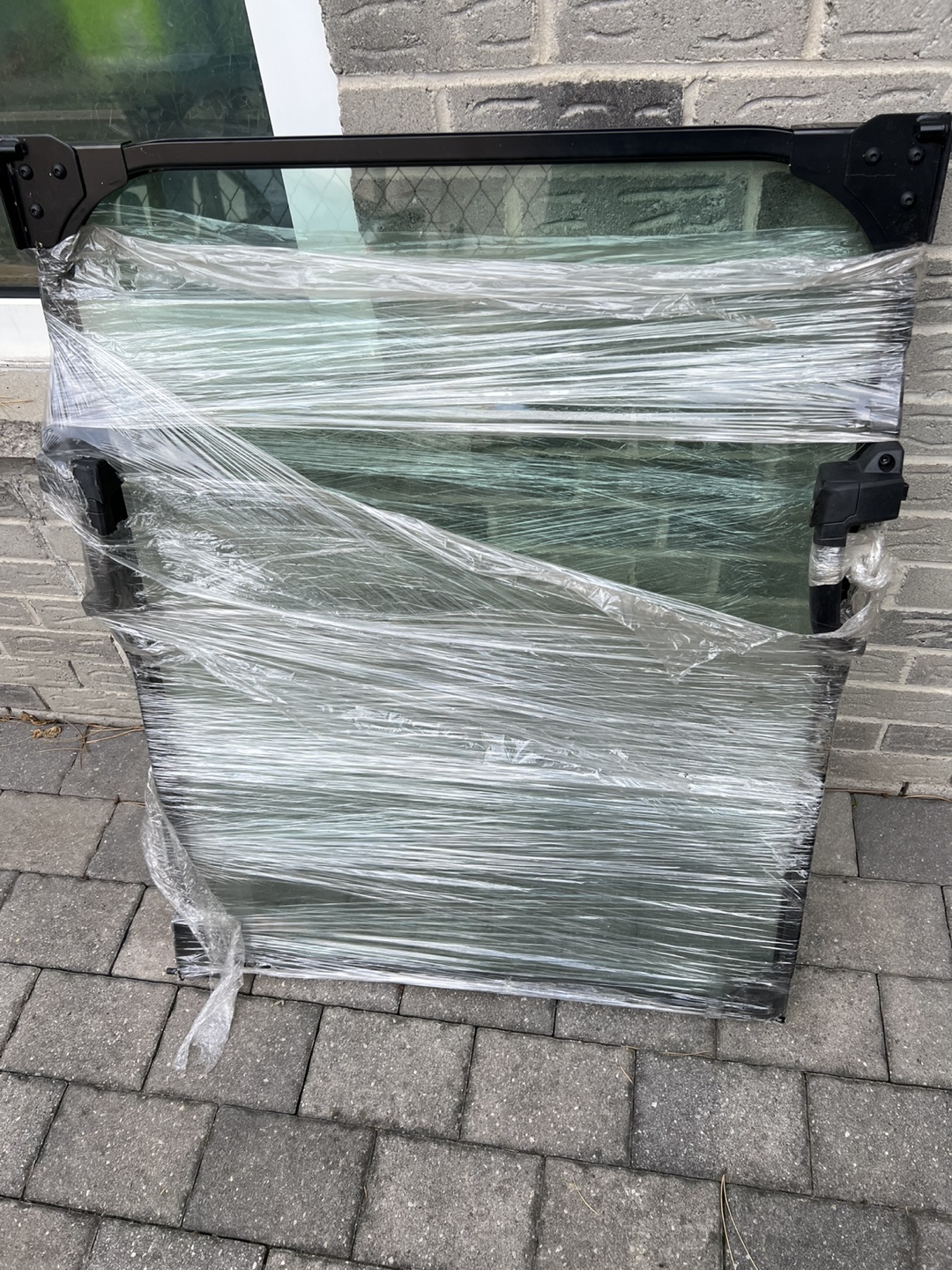 Selling a window glass with a black frame. It's currently wrapped in plastic for protection. The glass appears to be in good condition and ready for installation. Please take a look at the photos to see the details