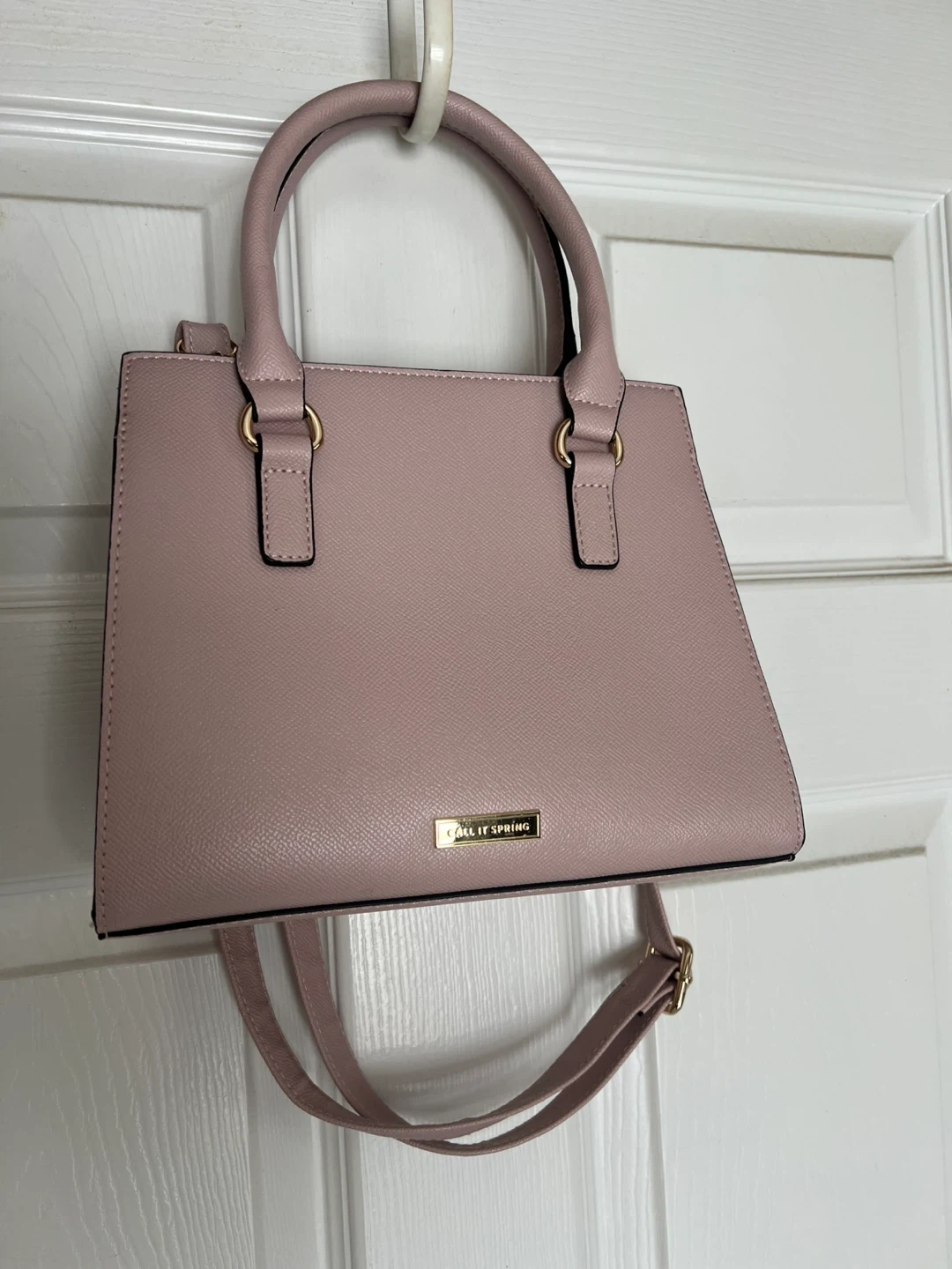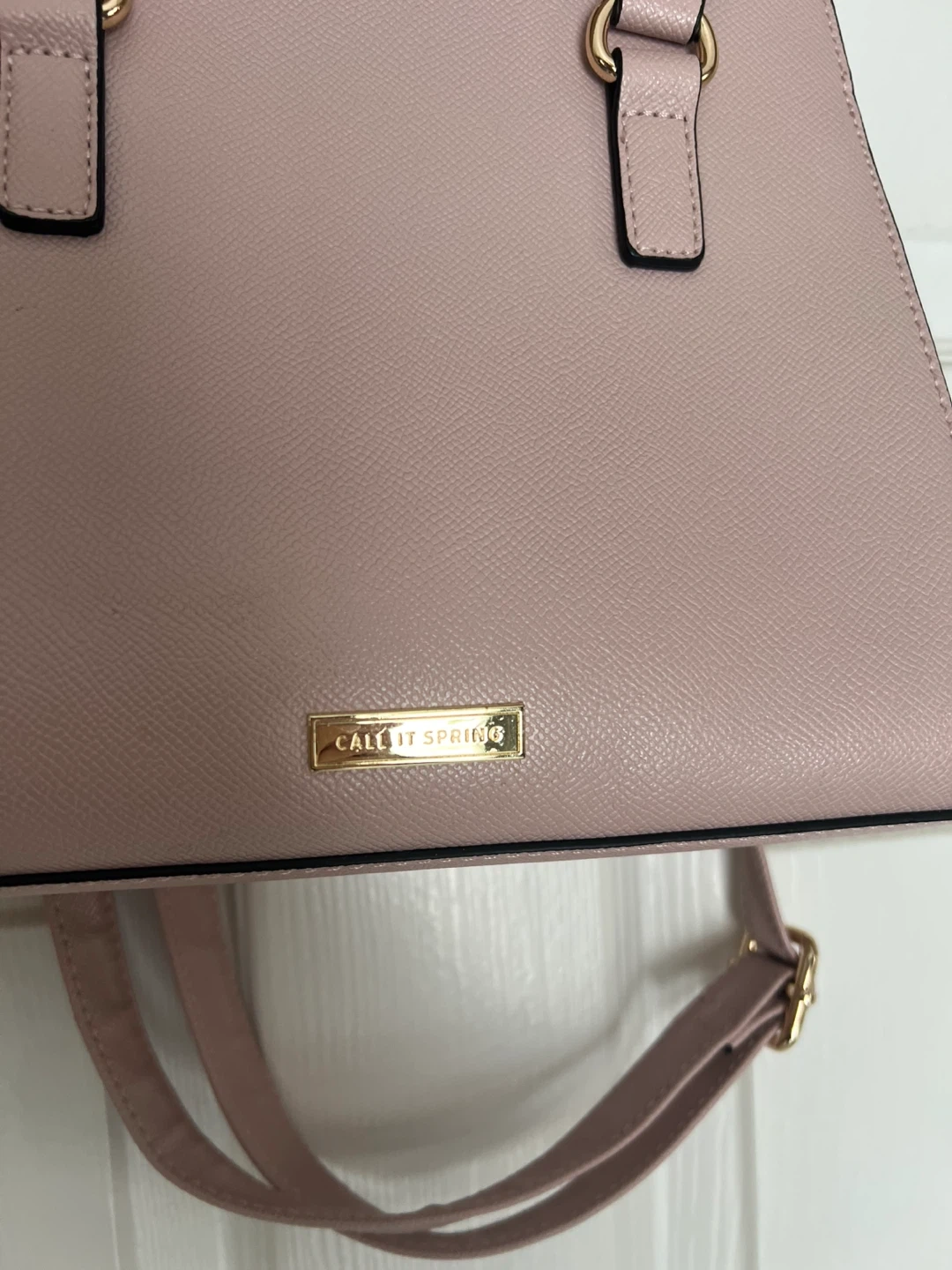 This is a pink satchel handbag from Call It Spring. It's made of faux leather and has gold hardware. It includes a detachable shoulder strap. Like new condition