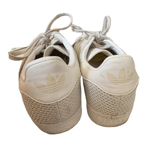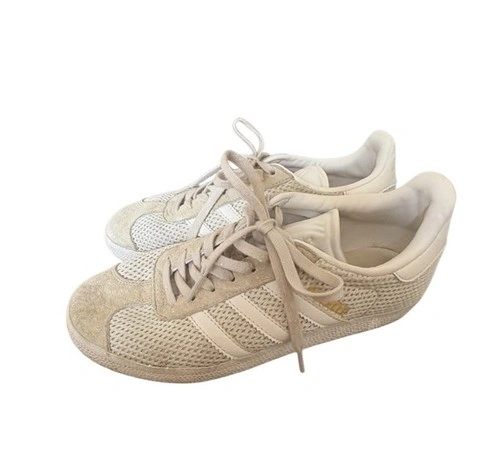 Stylish Adidas sneakers in cream and white. These women's Gazelle shoes have a summery low-cut knit upper and soft lining for breathability and comfort. A contrast heel and gold-print Gazelle and Trefoil logos add interest, finished with an iconic textured rubber outsole. This shoe is super unique and airy, perfect for summer and spring. Size 6.5. Condition: Used, pre-owned. Some signs of wear on the soles and throughout the suede.