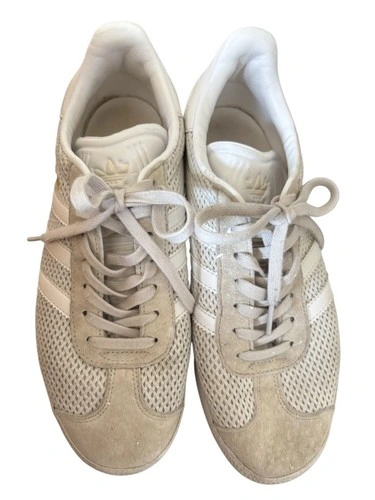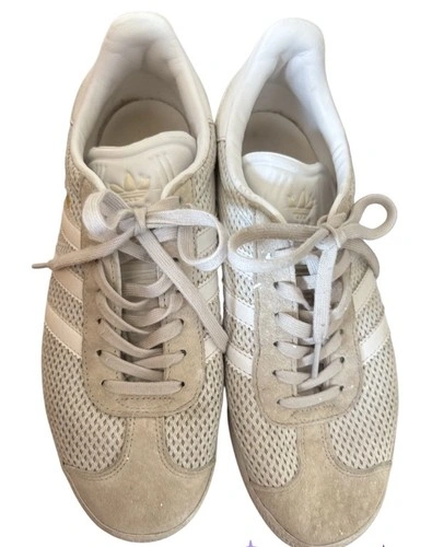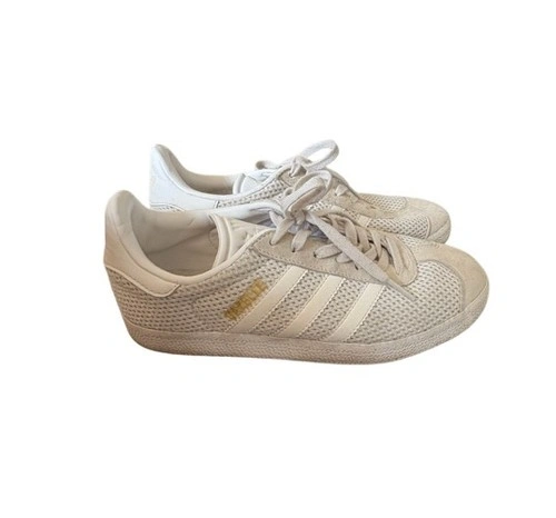 Stylish Adidas sneakers in cream and white. These women's Gazelle shoes have a summery low-cut knit upper and soft lining for breathability and comfort. A contrast heel and gold-print Gazelle and Trefoil logos add interest, finished with an iconic textured rubber outsole. This shoe is super unique and airy, perfect for summer and spring. Size 6.5. Condition: Used, pre-owned. Some signs of wear on the soles and throughout the suede.
