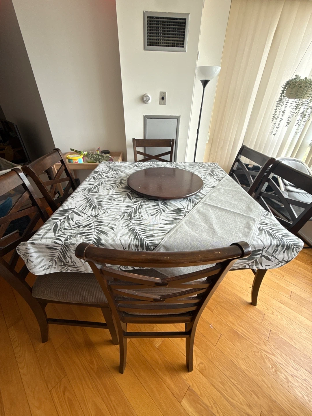 A wooden dining set featuring a rectangular table with a tropical leaf pattern tablecloth. It comes with six matching wooden chairs. Perfect for family meals or entertaining guests!