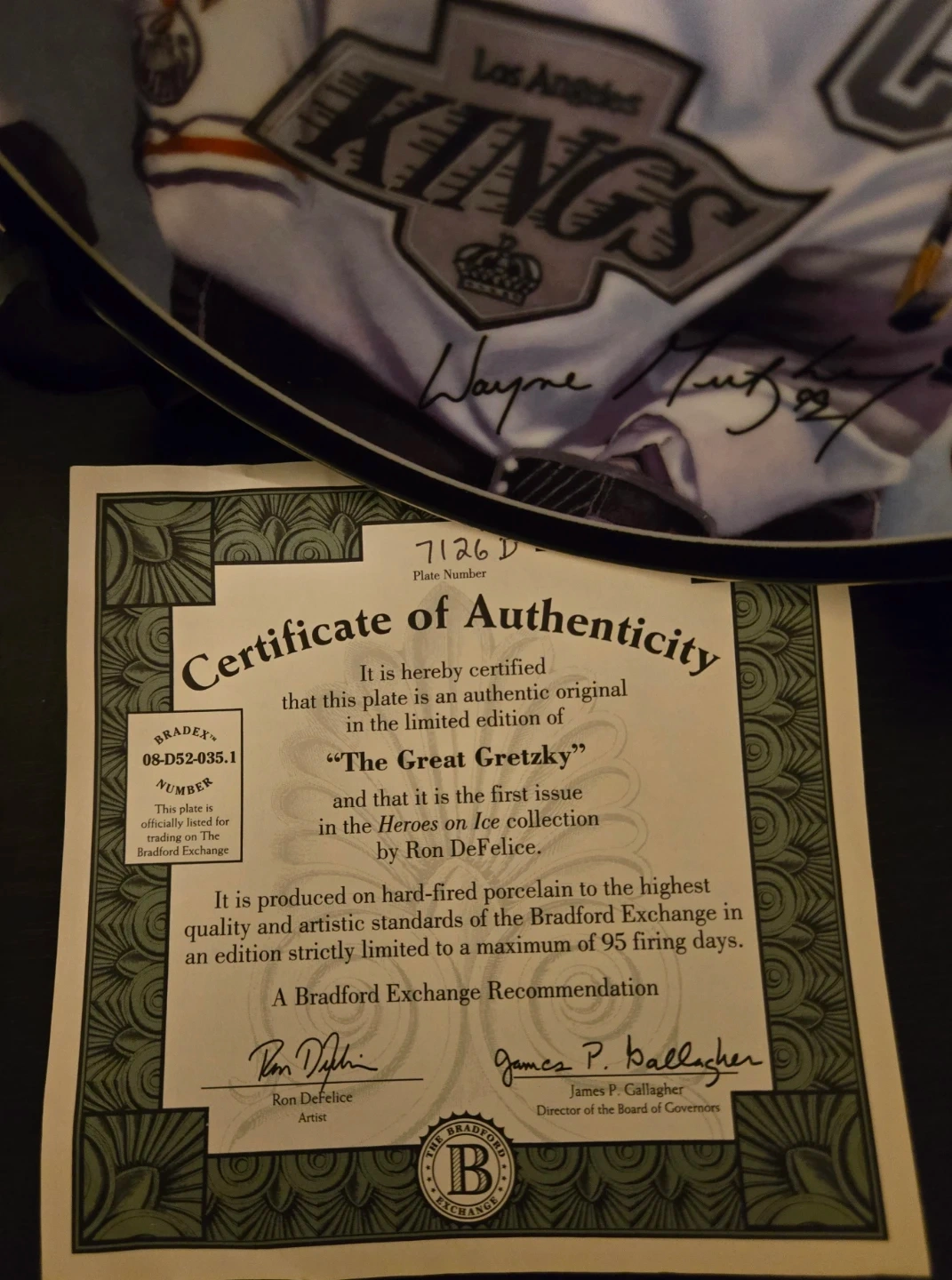 1. Great Gretzky Collectors Plate 1995 Bradford Exchange Heroes On Ice Collection. Limited Edition with Certificate of Authenticity and Box. Like New.