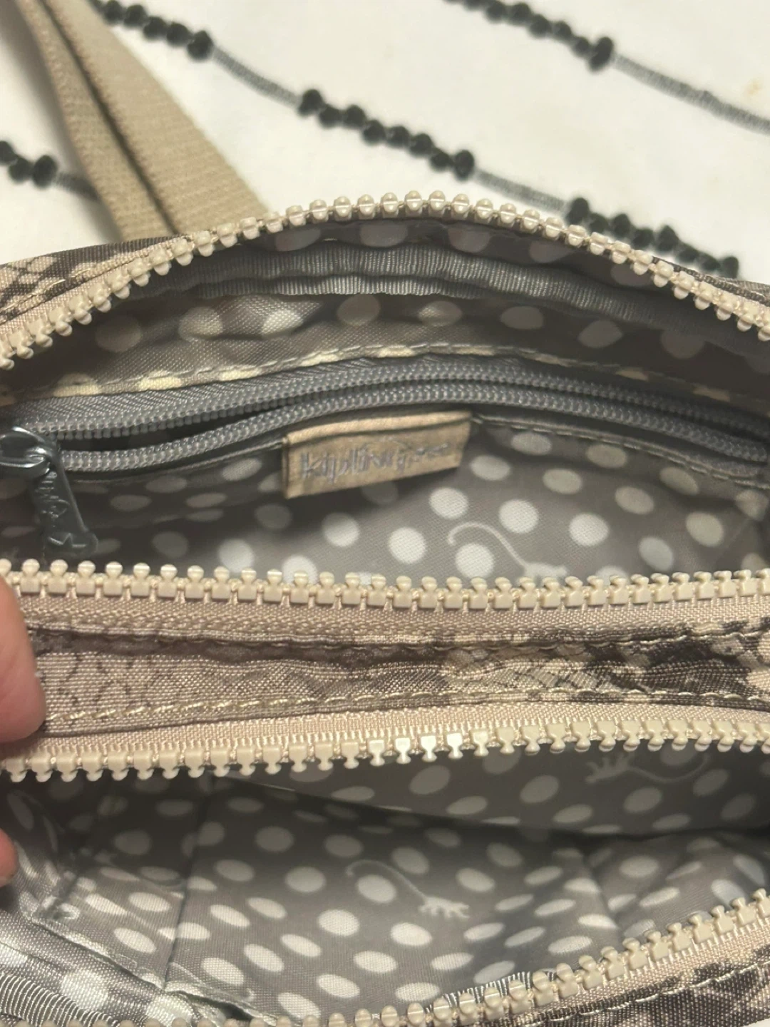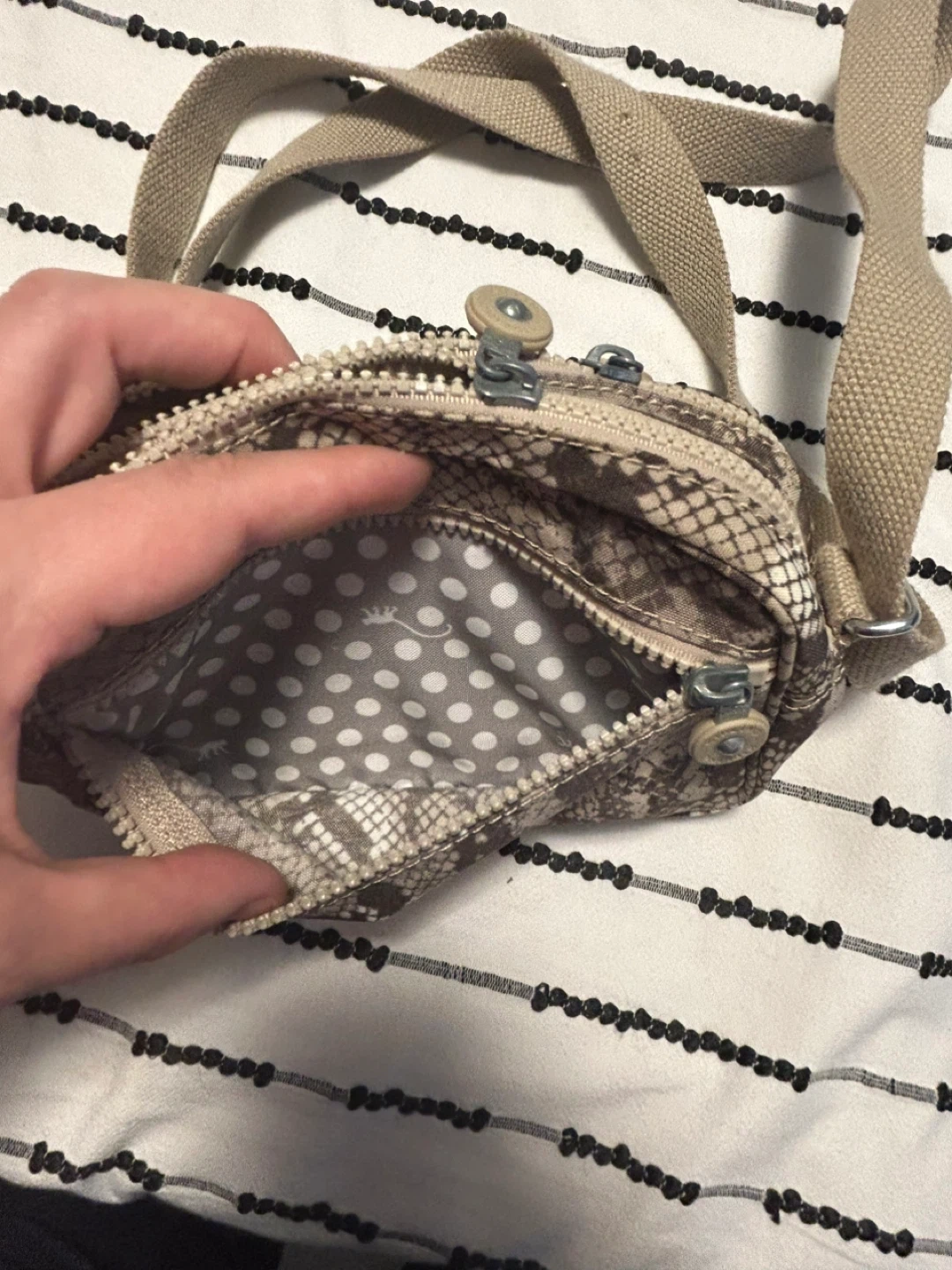 This Kipling crossbody bag features a stylish snake print design. It has multiple zippered compartments to keep your essentials organized. It's perfect for everyday use when you need to keep your hands free! 21 cm x 15 cm, I lost the monkey keychain