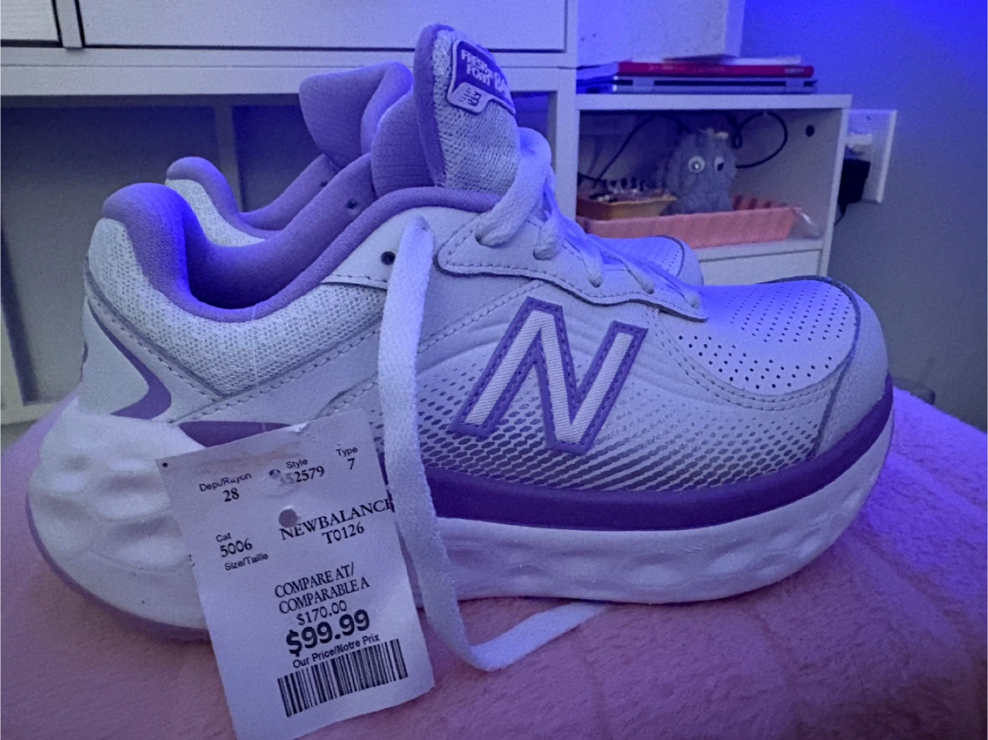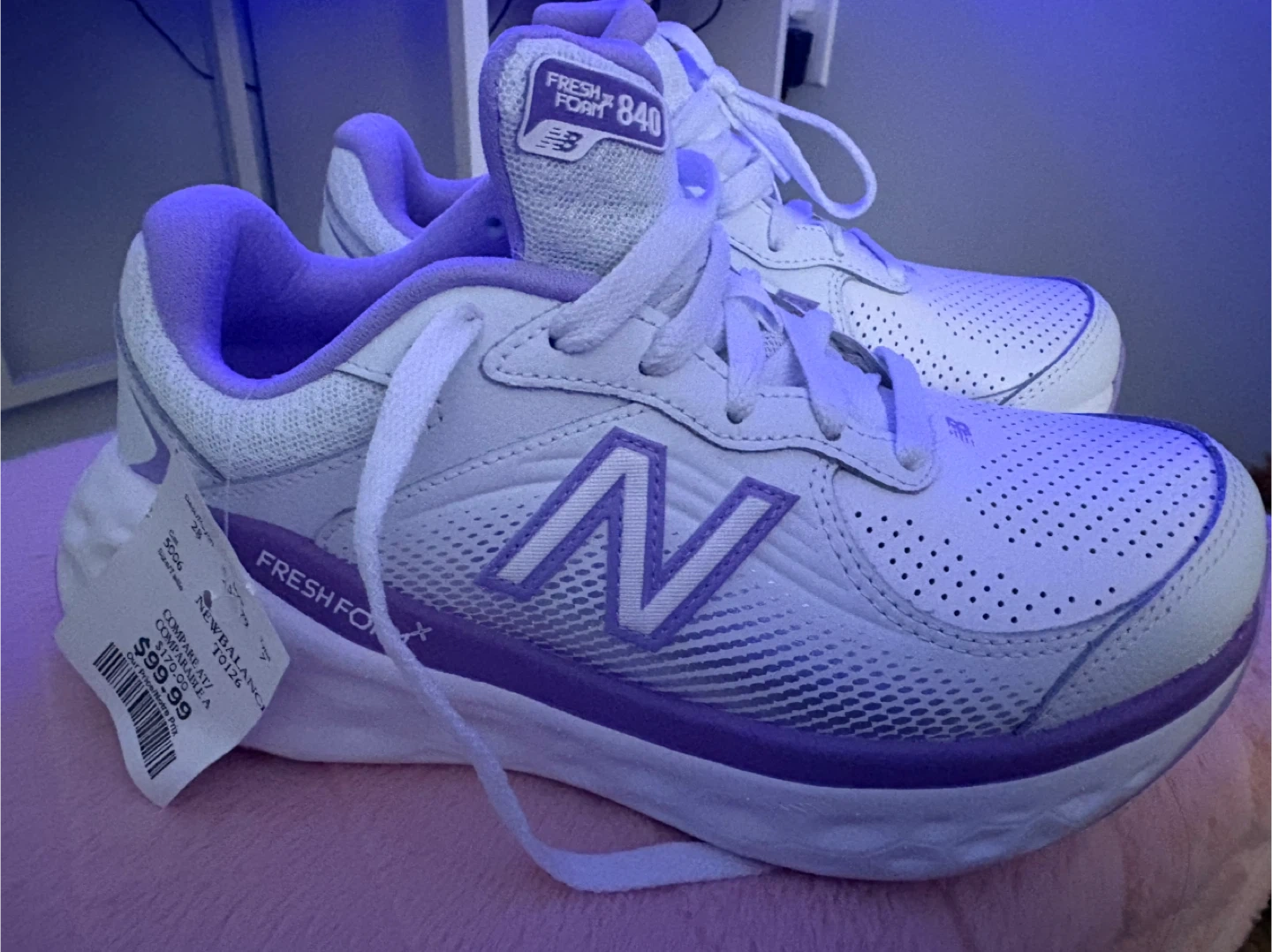 White and purple New Balance Fresh Foam X 840 running shoes. These sneakers feature a breathable mesh upper and Fresh Foam X cushioning for comfort. Size 7 Women's.