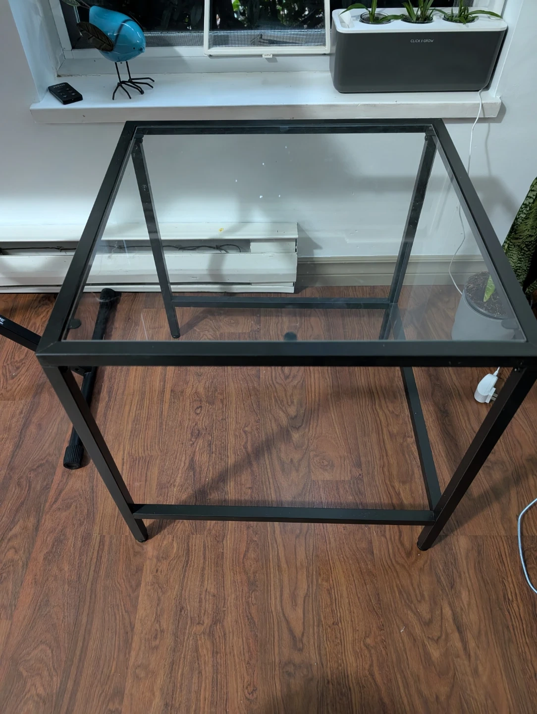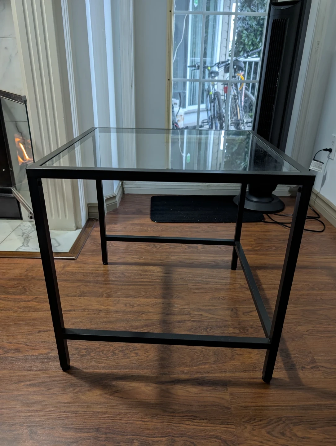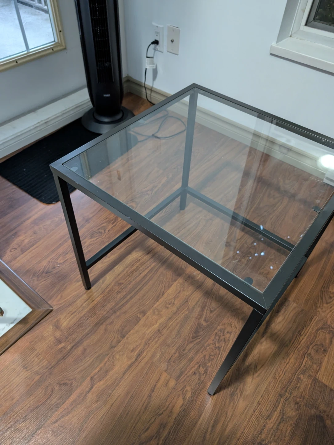 Selling a side table with a glass top and a black metal frame. It's in good condition and would be perfect for a living room or bedroom.