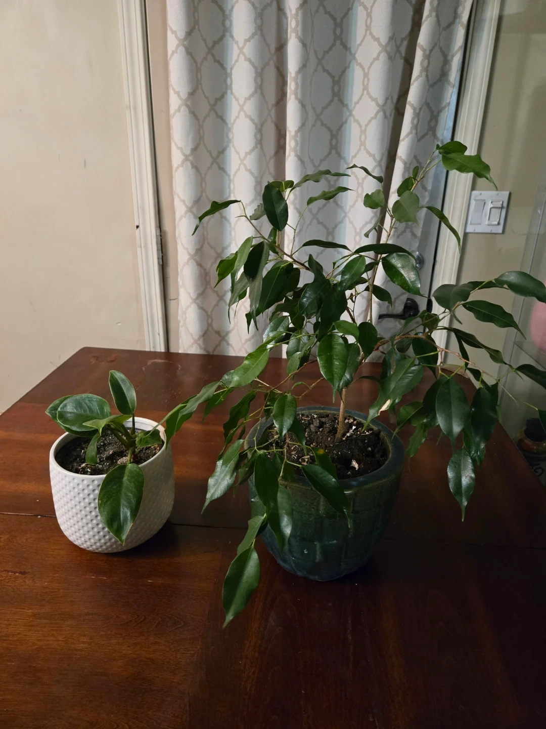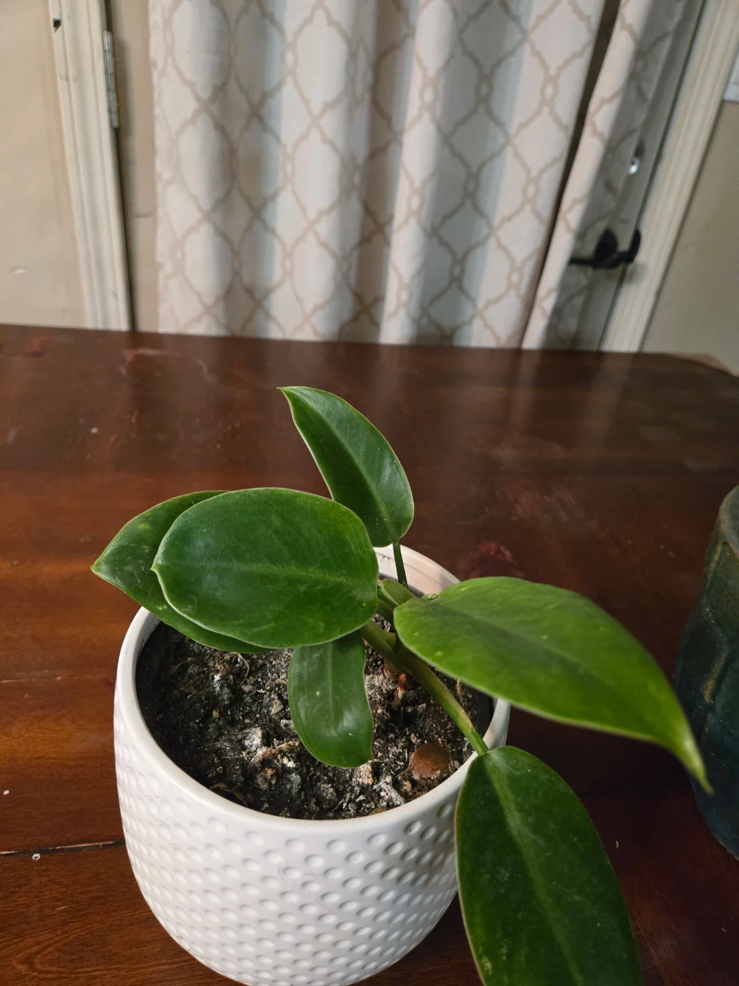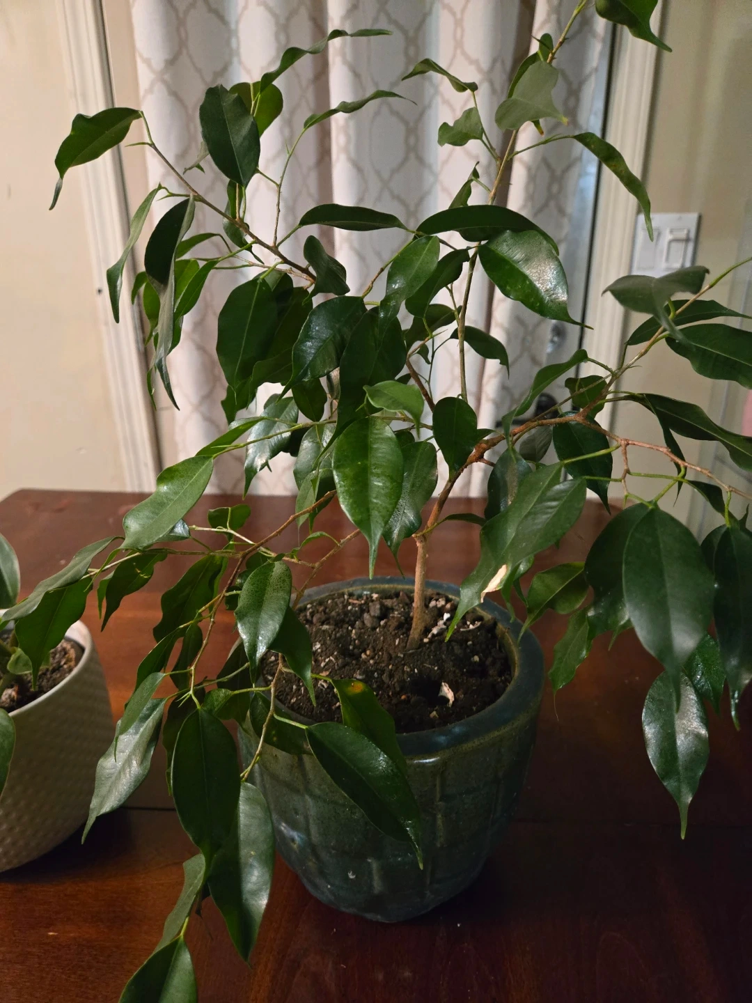 Healthy indoor plant with glossy green leaves. It's potted in a textured dark green ceramic planter. This plant adds a touch of nature to any space!
