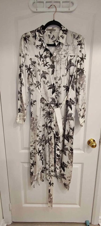 Unique ALLSAINTS Tilly Evolution shirt dress. White with cool black and gray botanical print, featuring butterflies and subtle skeletons. Long sleeve, button-front, and tie waist. Brand new.