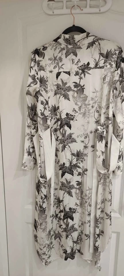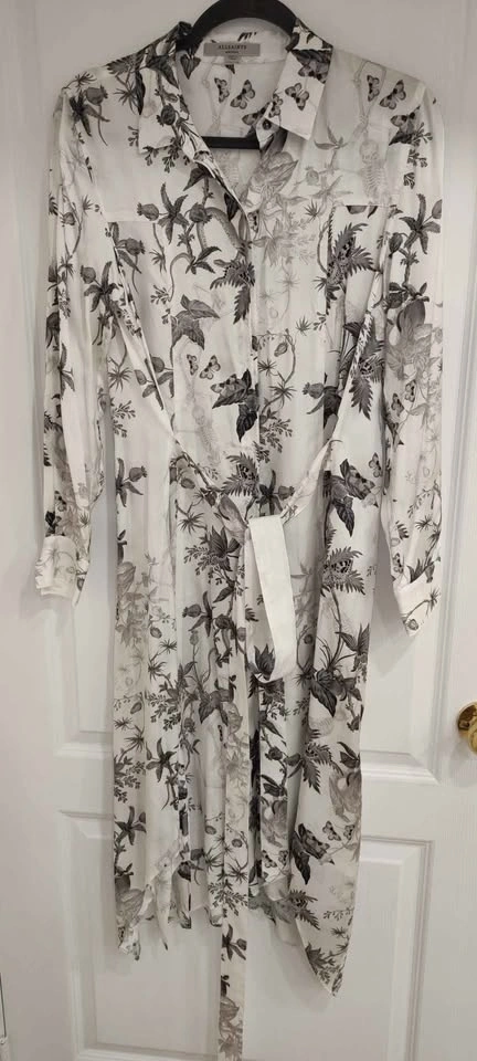 Unique ALLSAINTS Tilly Evolution shirt dress. White with cool black and gray botanical print, featuring butterflies and subtle skeletons. Long sleeve, button-front, and tie waist. Brand new.