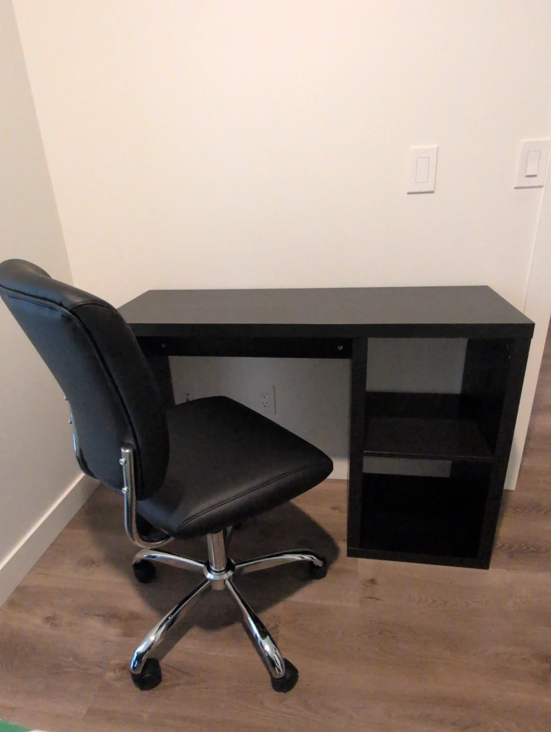 This black office chair from Staples features a faux leather seat and chrome base with wheels. It's paired with a black-brown IKEA KALLAX desk that has built-in shelving. The desk dimensions are 111x39 cm.