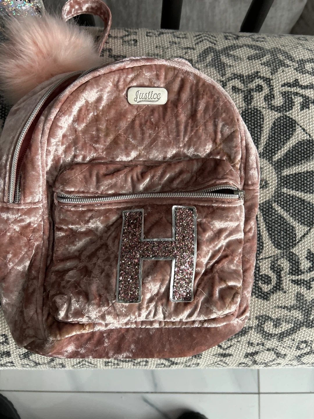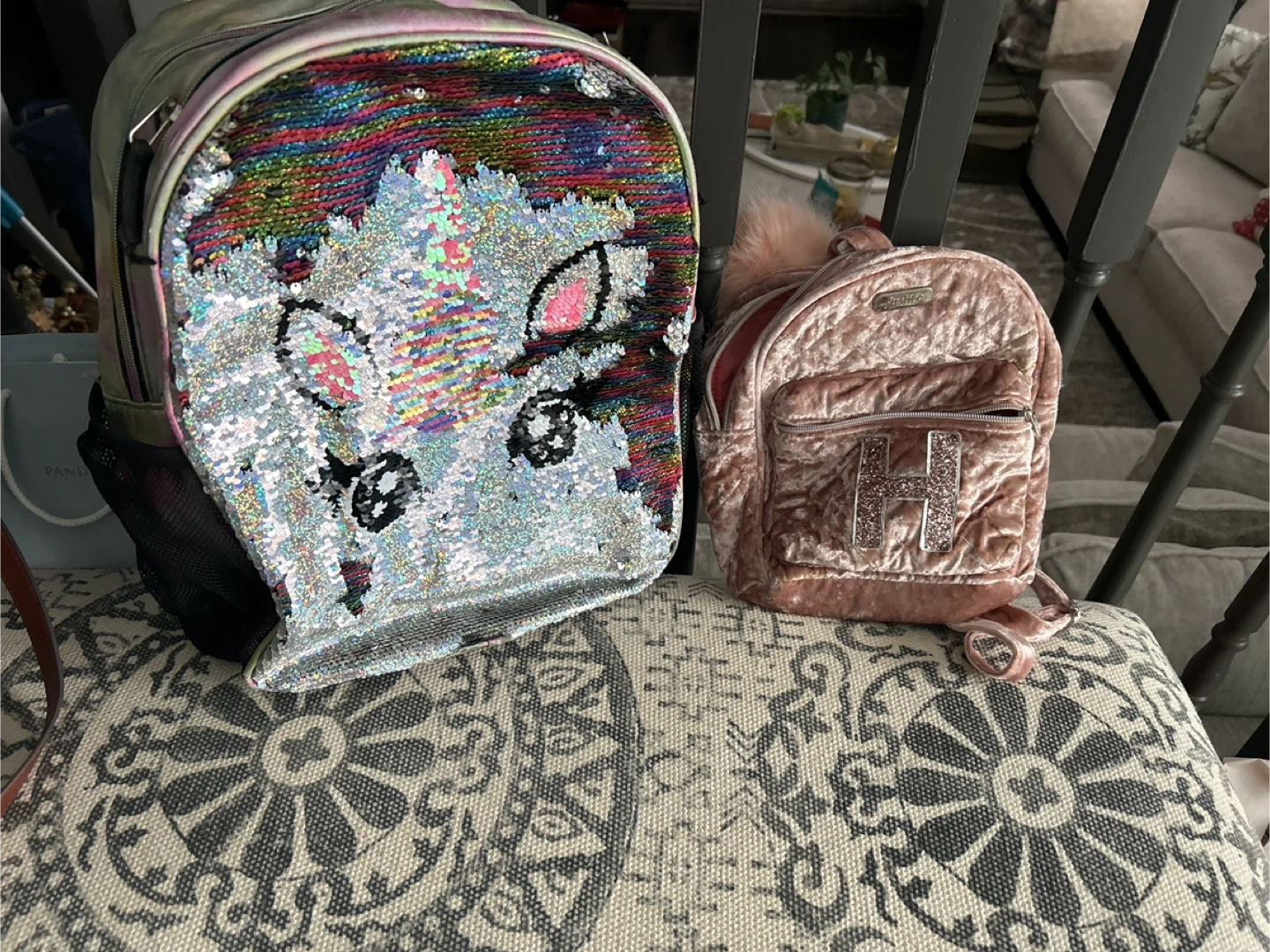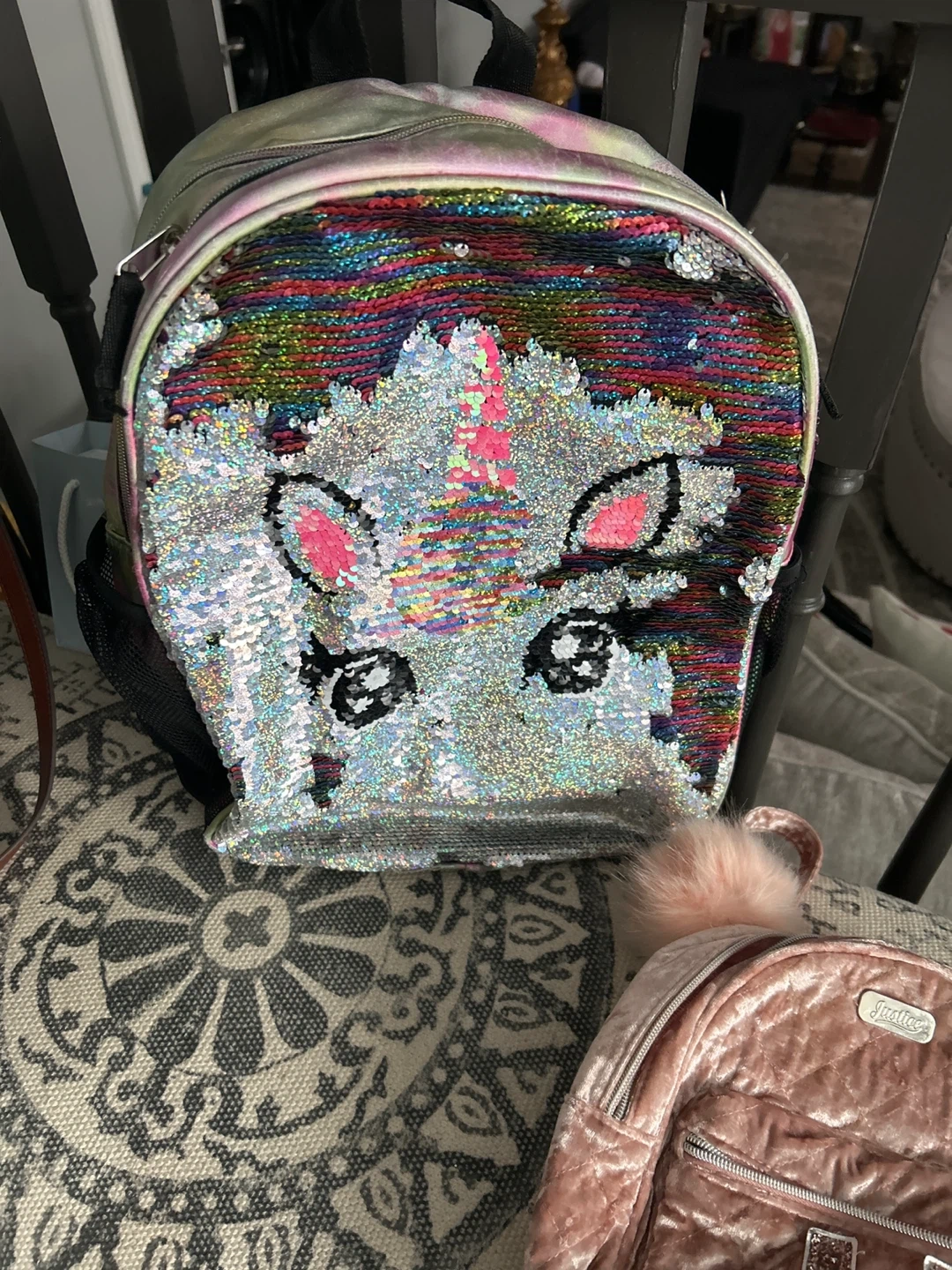 Selling two cute backpacks! One is a larger backpack with a sequin unicorn design, and the other is a smaller pink velvet backpack from Justice. Both are in good condition and ready for a new home!