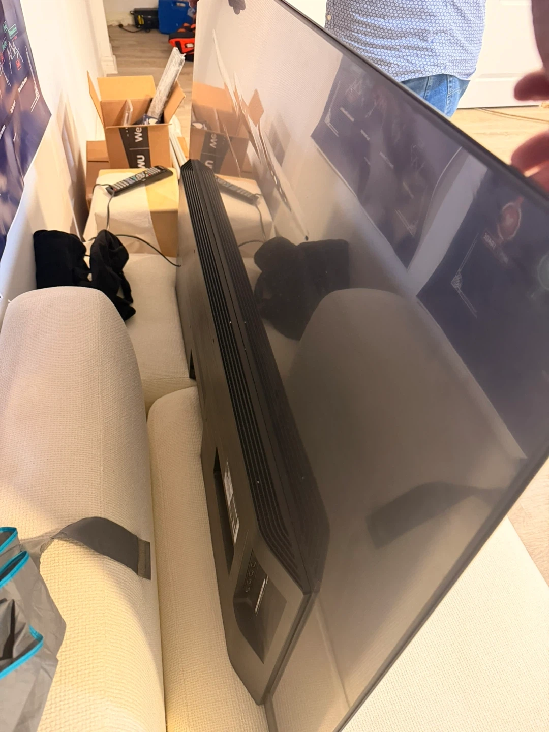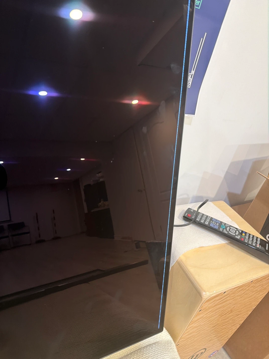 TV powers on and works, but there is a vertical line on the right side of the screen (see photos). Everything else functions normally including HDMI ports, sound, and smart features.