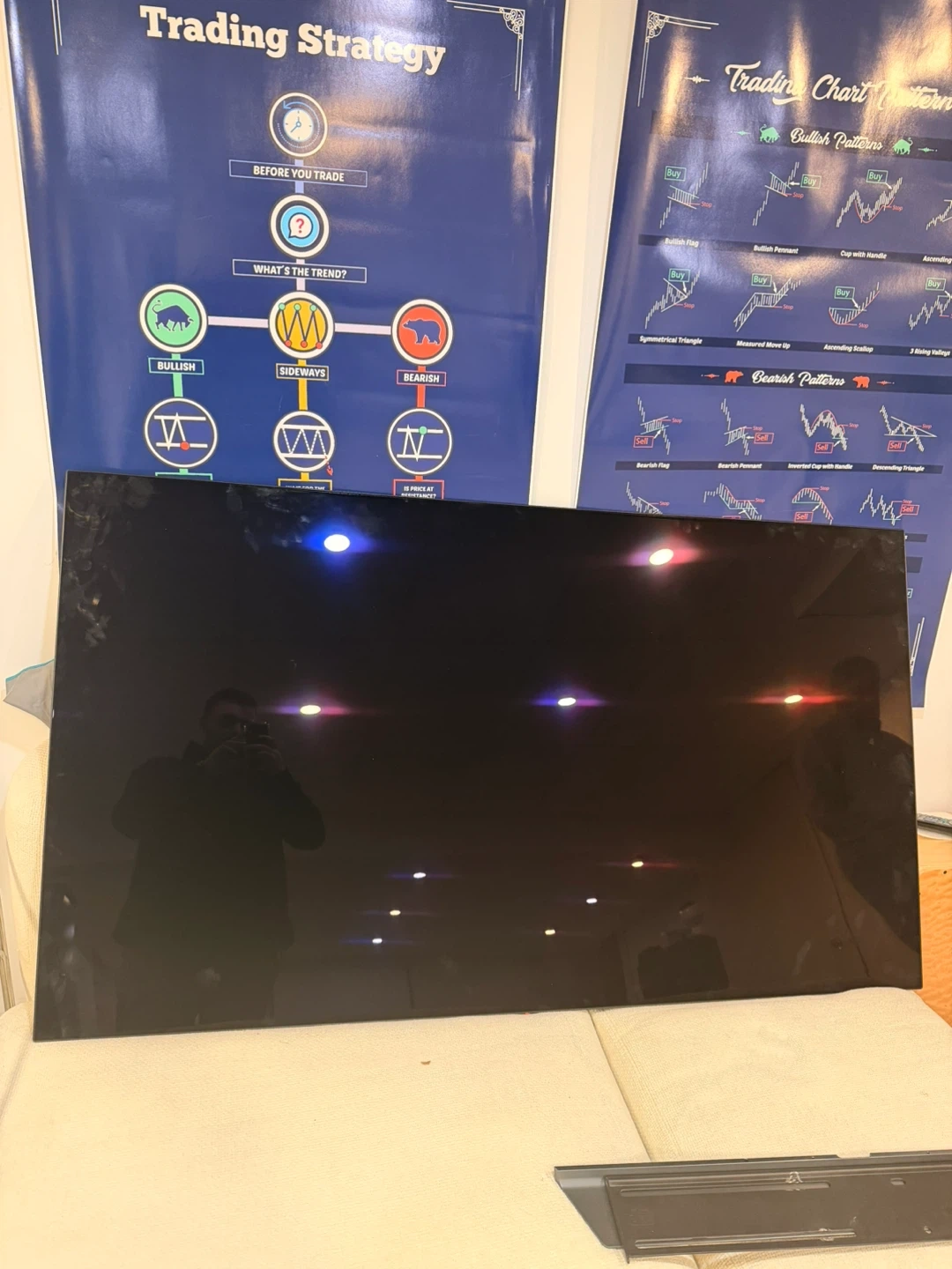 TV powers on and works, but there is a vertical line on the right side of the screen (see photos). Everything else functions normally including HDMI ports, sound, and smart features.