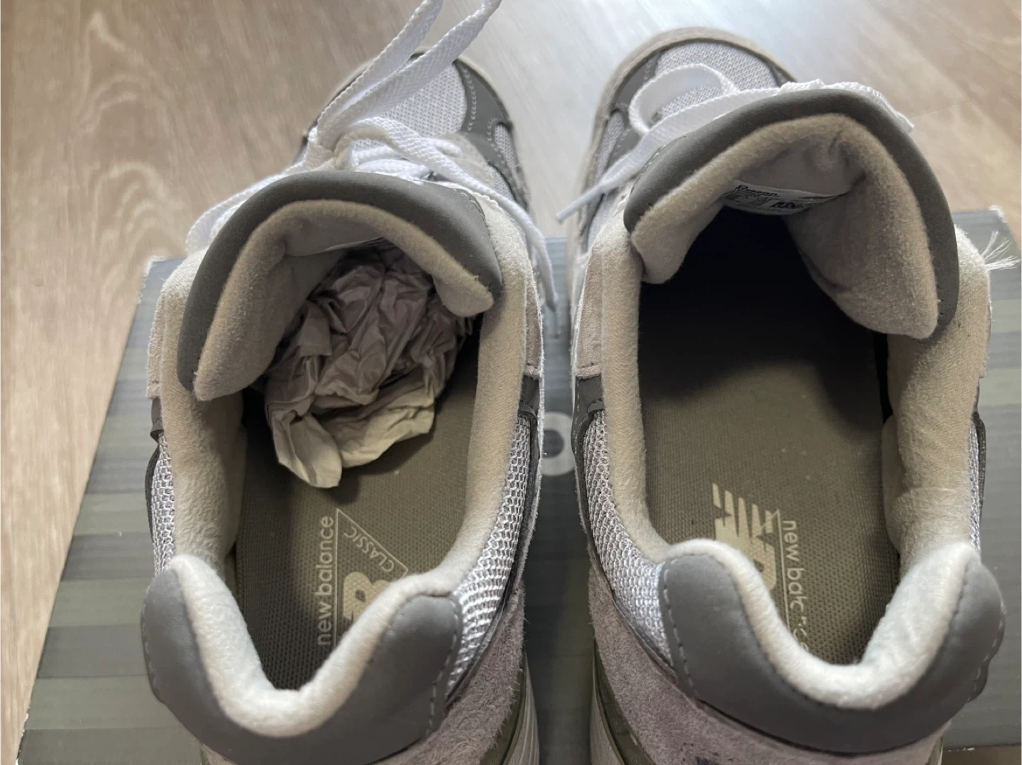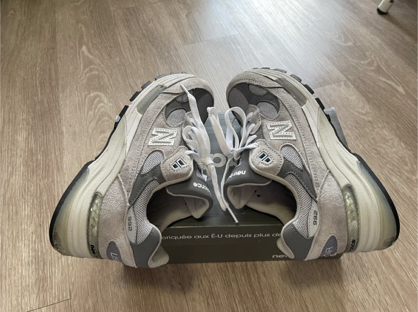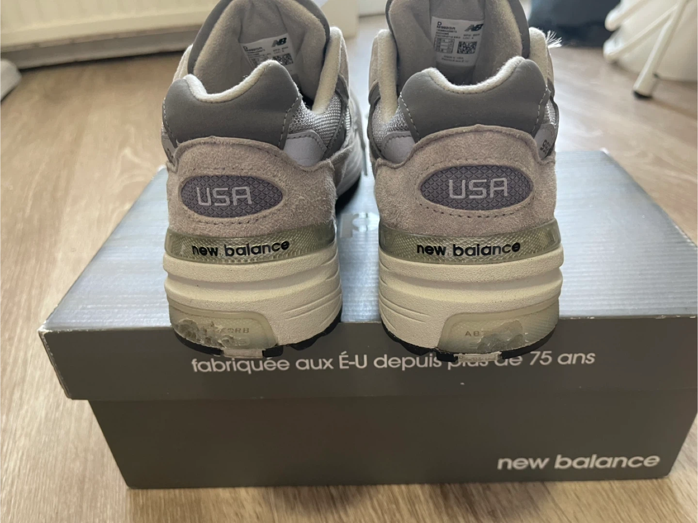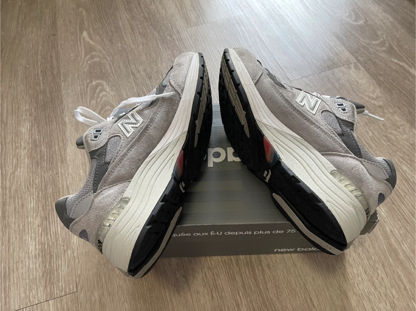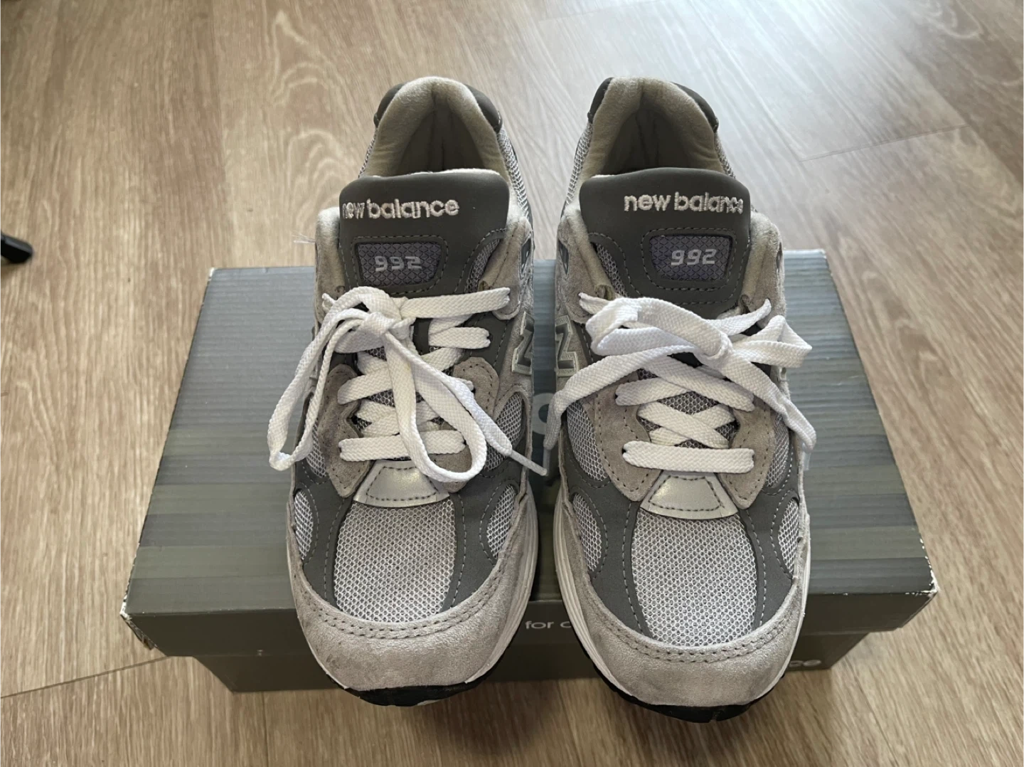 Classic New Balance 992 running shoes in a versatile grey colourway. These sneakers are crafted with a mix of suede and mesh materials for comfort and durability. Original box included.