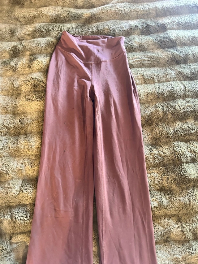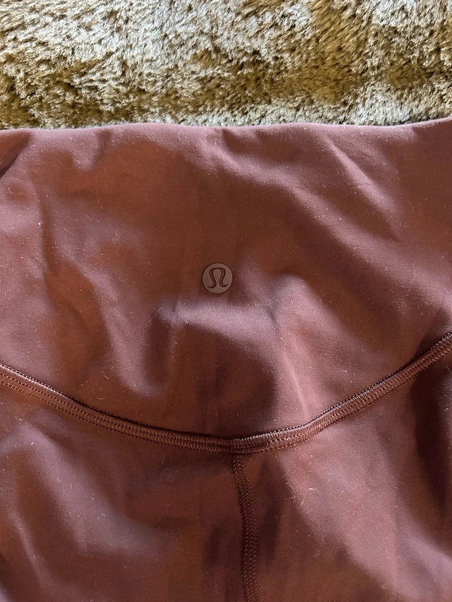 These are used brown Lululemon flared leggings in a size 2, perfect for yoga, workouts, or casual wear. They are in good condition, ready for a new home. Brand: Lululemon, Size: 2, Colour: Brown, Style: Flared Leggings. Cash accepted.