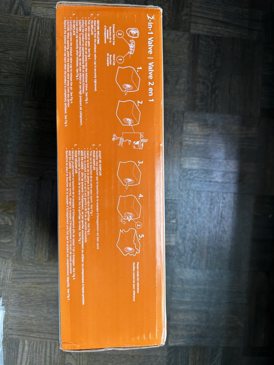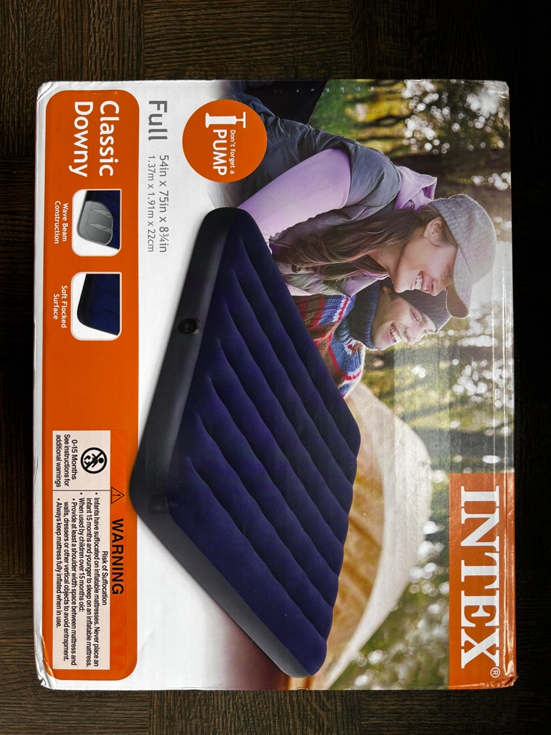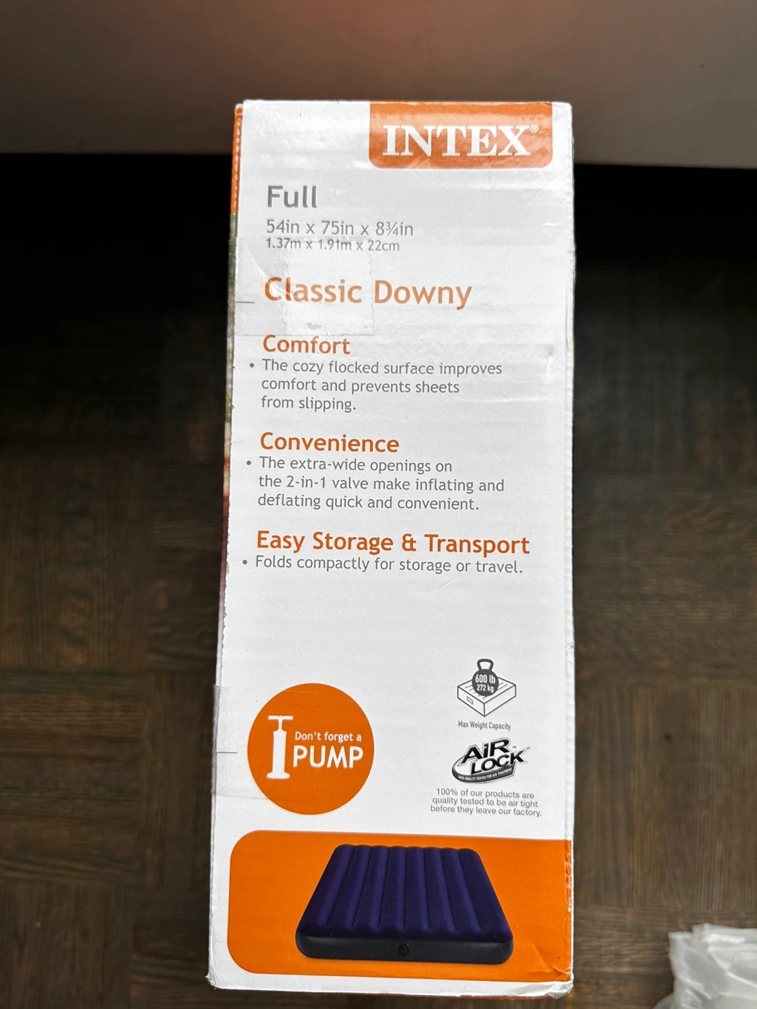 An Intex Classic Downy full airbed in the box, perfect for a relaxing night's sleep. The box shows a full airbed that has a flocked surface, wave beam construction, and a 2-in-1 valve.