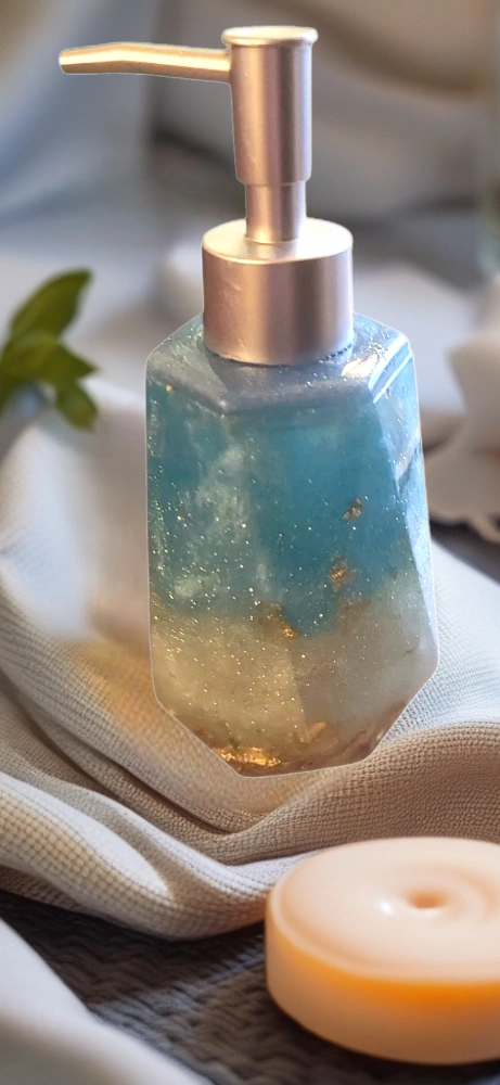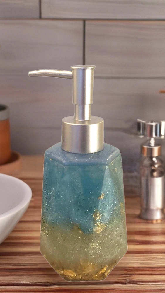 Elevate your bathroom decor with this exquisite handmade resin Bathroom Soap Dispenser in a captivating teal blue and gold scheme. It is meticulously handcrafted, ensuring uniqueness and quality.