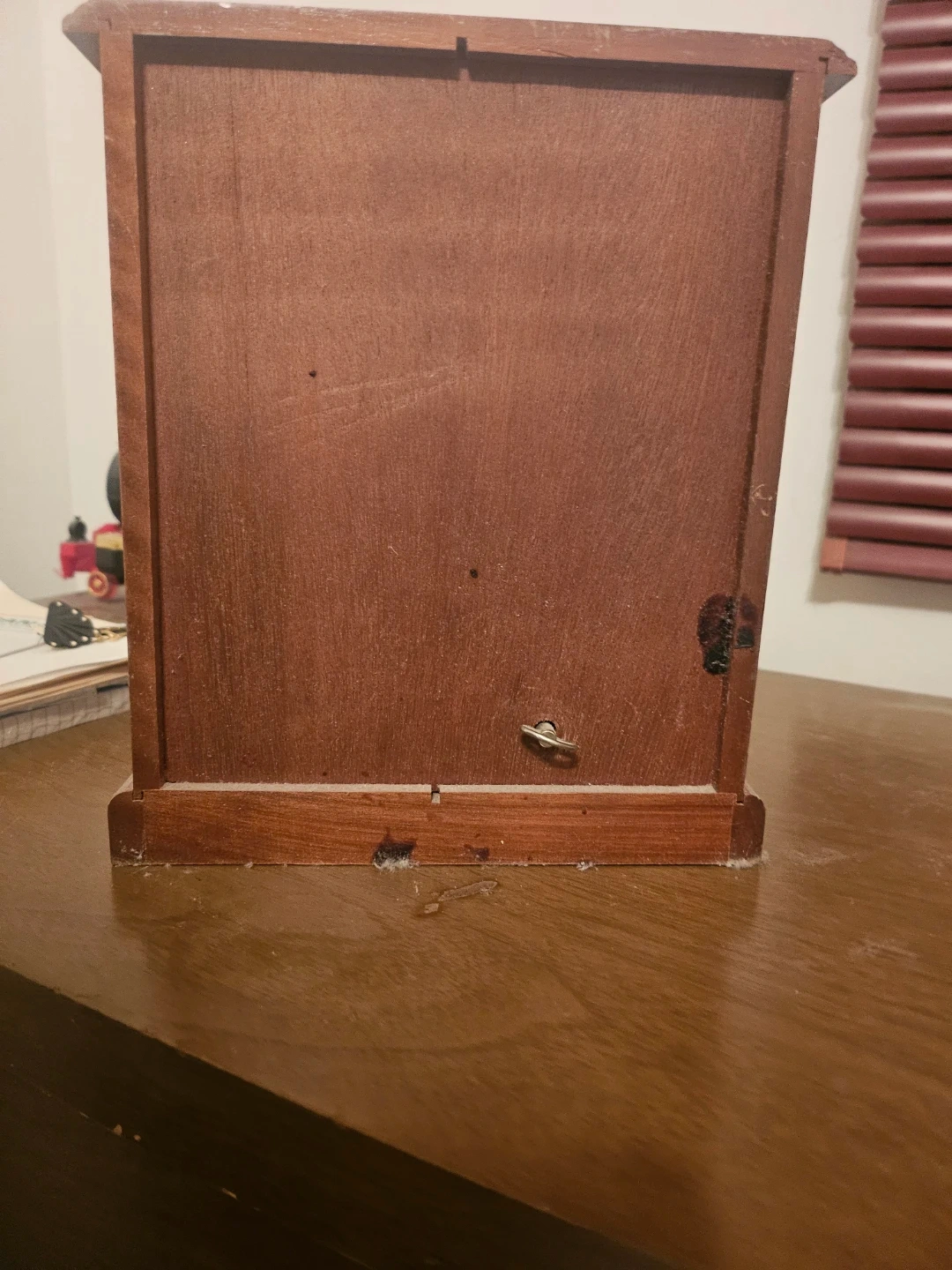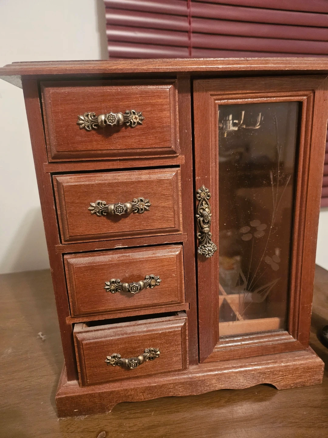This wooden musical jewellery box has four drawers and a mirrored door. The inside has compartments for organizing your accessories. It has a lovely antique look and feel. Useful for keeping your rings, earrings, and necklaces tidy!