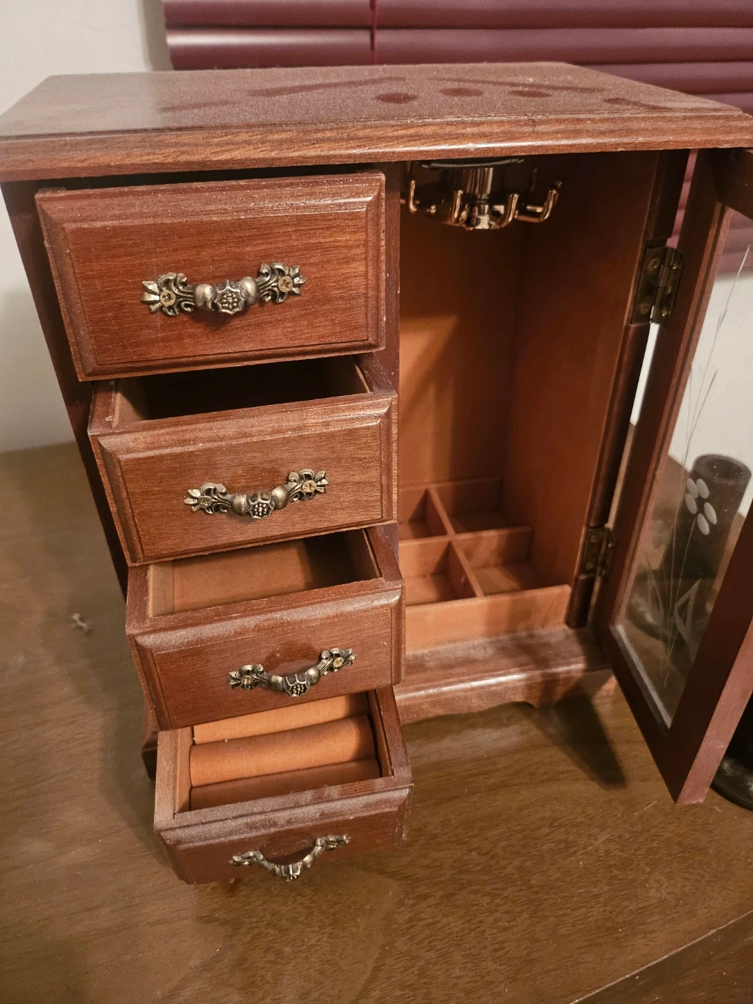 This wooden musical jewellery box has four drawers and a mirrored door. The inside has compartments for organizing your accessories. It has a lovely antique look and feel. Useful for keeping your rings, earrings, and necklaces tidy!