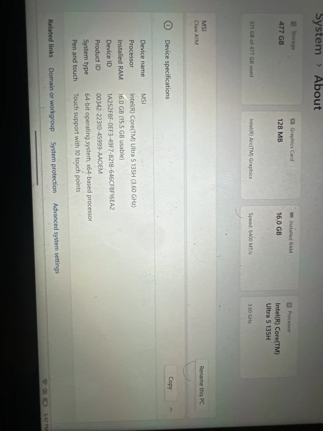MSI Claw AIM handheld gaming PC with Intel Core Ultra 5 processor and 16GB RAM. It has a 128MB graphics card and 477GB of storage. Runs Windows 11 Home with 64-bit operating system. Features 64-bit operating system, pen and touch support with 10 touch points.