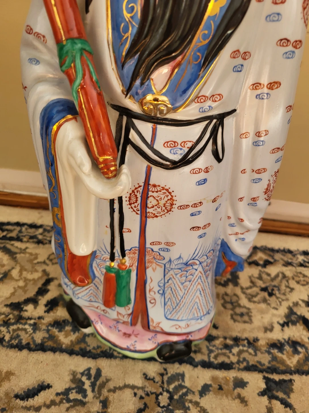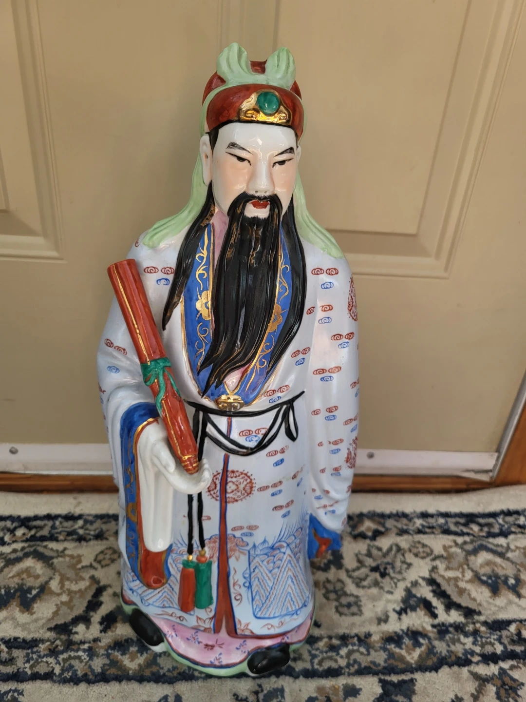 This is a large, decorative porcelain figurine of a Chinese Scholar. It's intricately painted with a white robe featuring blue and red cloud and mountain patterns, and gold accents. He holds a red scroll with green ribbon detail. This piece would make a statement in any room.