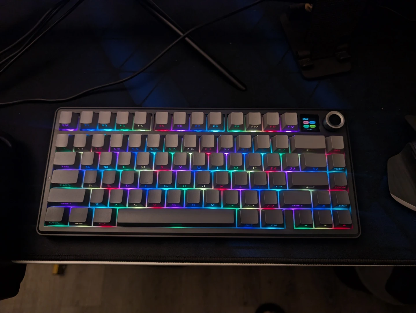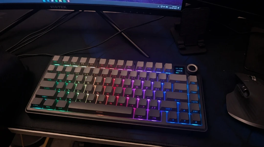 AULA F75 Max 3-in-1 hot-swappable RGB gasket mechanical keyboard. It features a TFT screen and multi-functional knobs. Includes receiver for wireless connectivity.