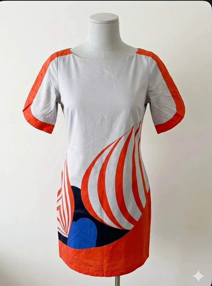 Short dress features a bold graphic print with orange, white, and blue accents. It has a relaxed fit with a boat neckline and short sleeves. Made from a light fabric, it's perfect for warmer weather.