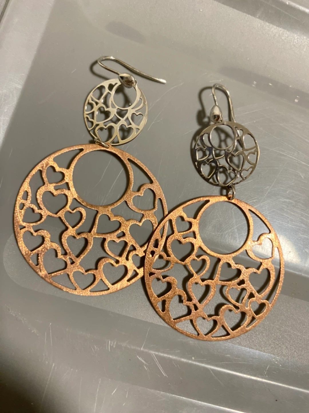 These are a pair of dangling earrings with a heart cutout design. One earring has a silver top and copper bottom, while the other appears to be all silver. They're in good condition!