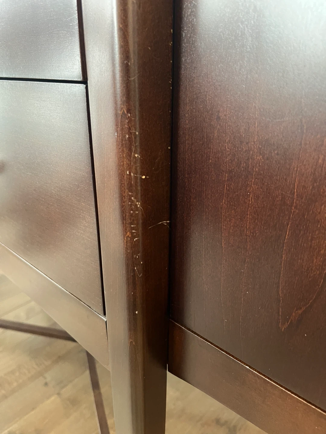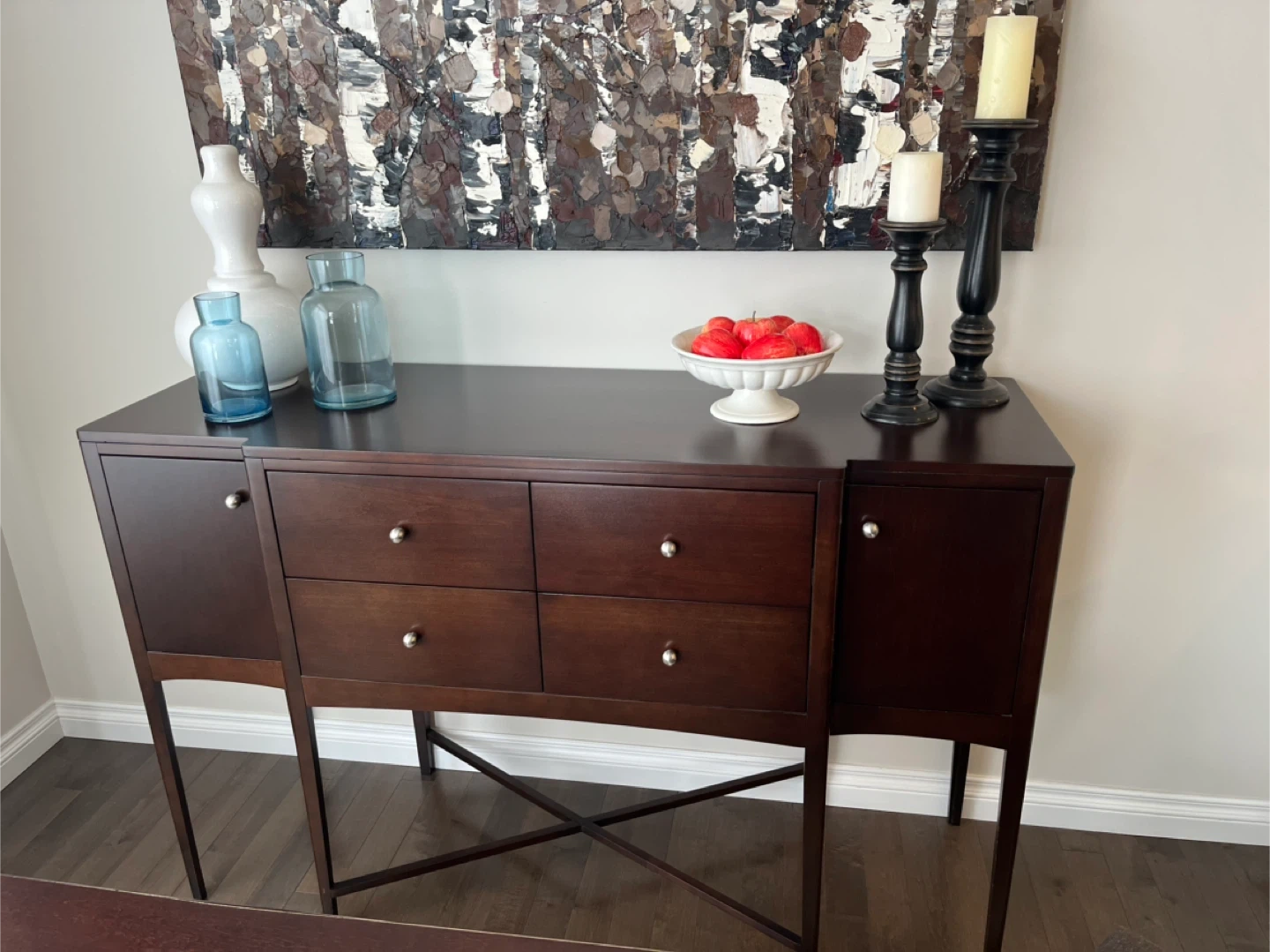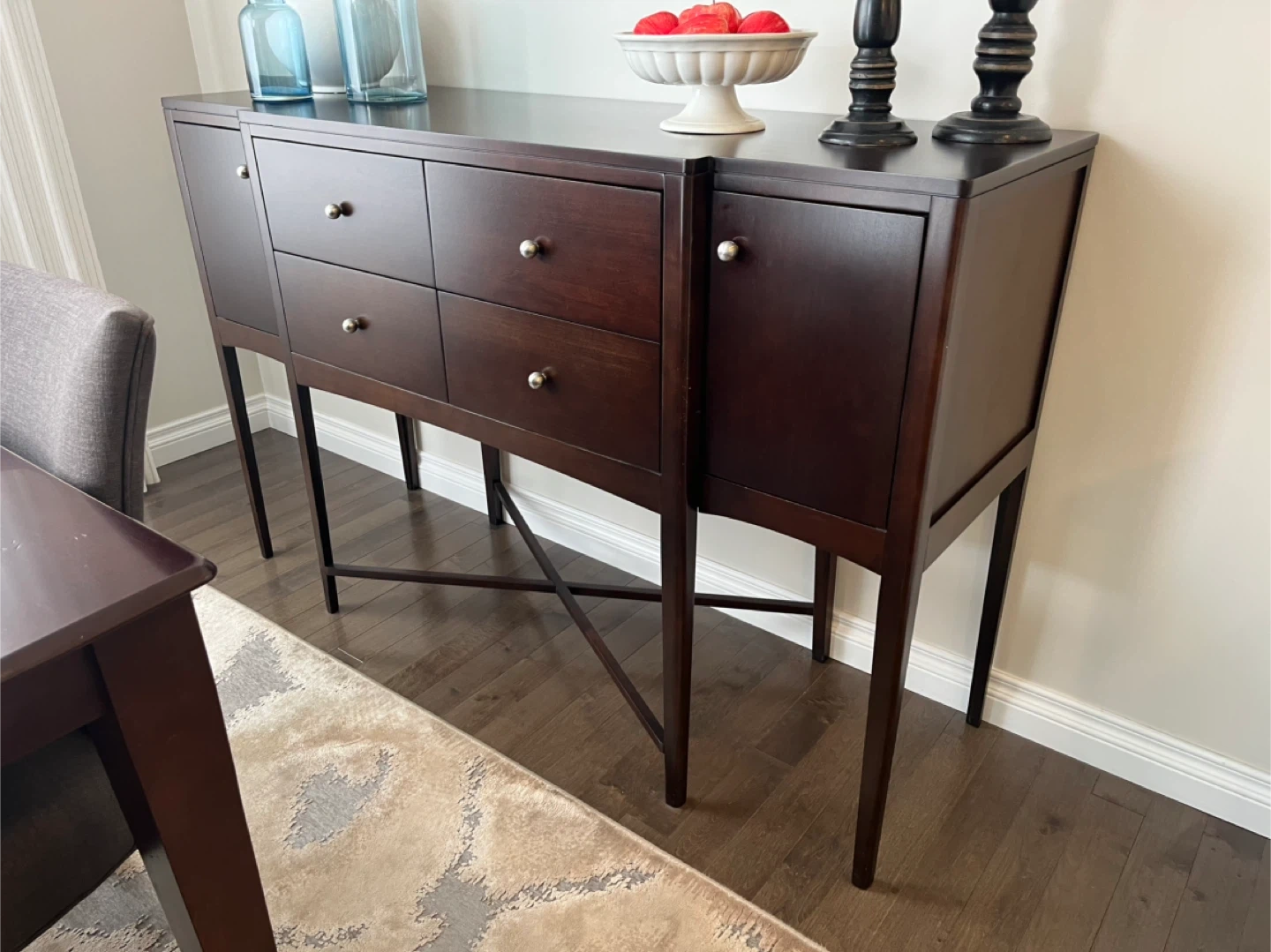 Dark wood buffet with four drawers and two cabinet doors. Dovetail drawer construction is visible inside. Some minor scuffs on the side panel. It's a stylish piece for your dining room or living area.