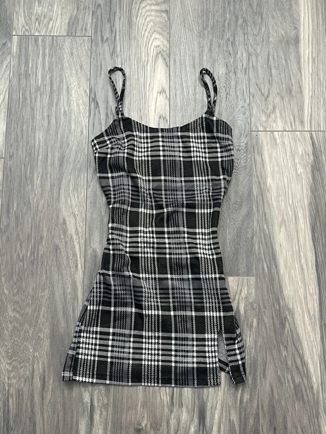 Black and grey fitted mini dress. Features small slit and adjustable straps to cater to your comfort. Cute and simple. No damage, like new.