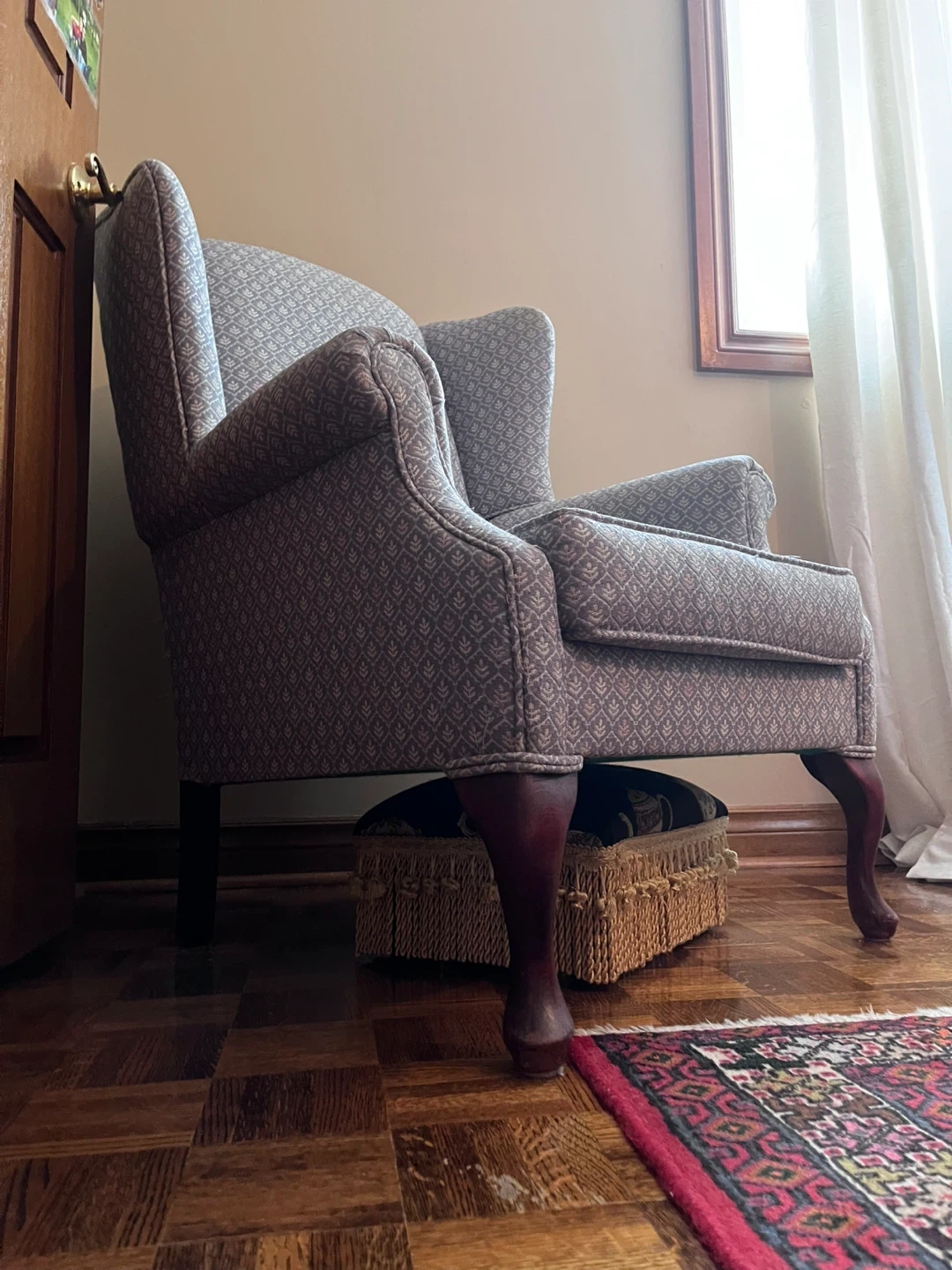 Classic wingback armchair upholstered in a patterned fabric. Features ornate wooden legs. Provides comfortable seating. $90 FOR BOTH. message for separate!