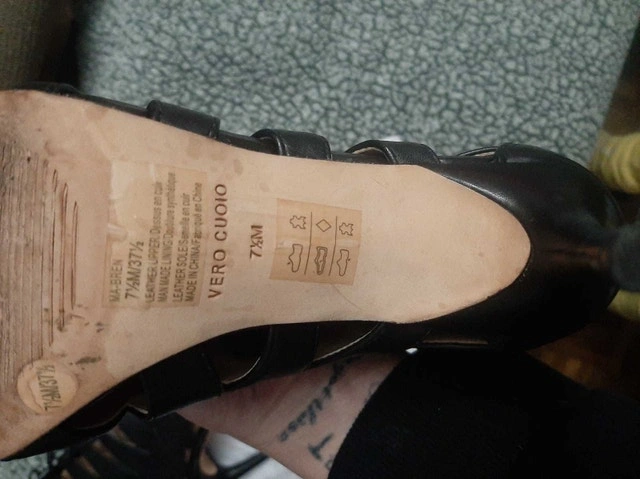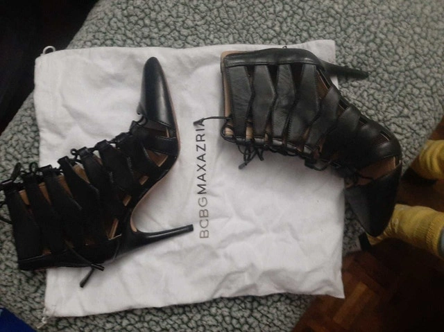 Step out in style with these BCBGMAXAZRIA black leather strappy stiletto heels in size 7.5, offering a chic and edgy look. These heels are in used condition, but still have a lot of life left in them, perfect for adding a touch of sophistication to any outfit.