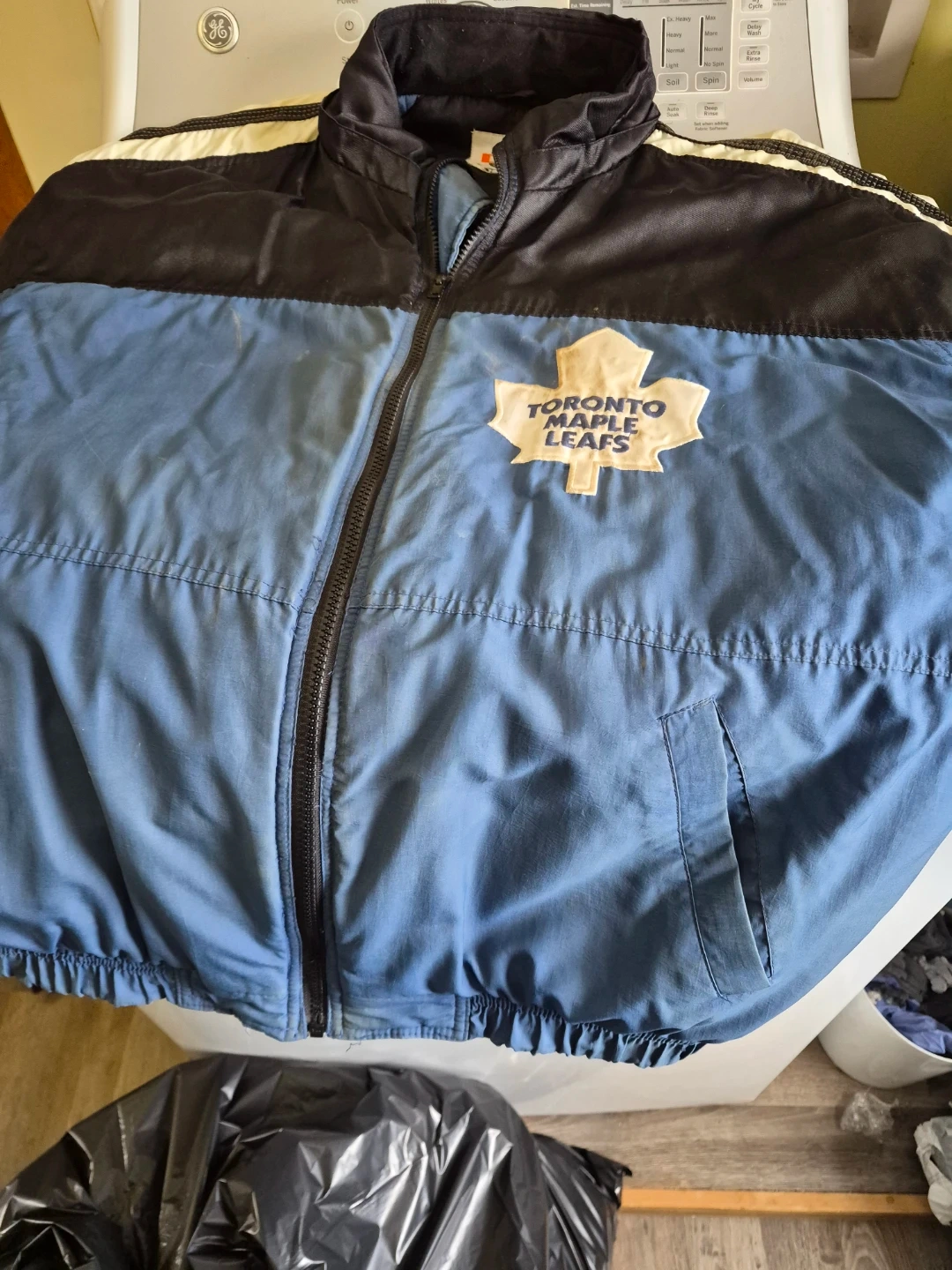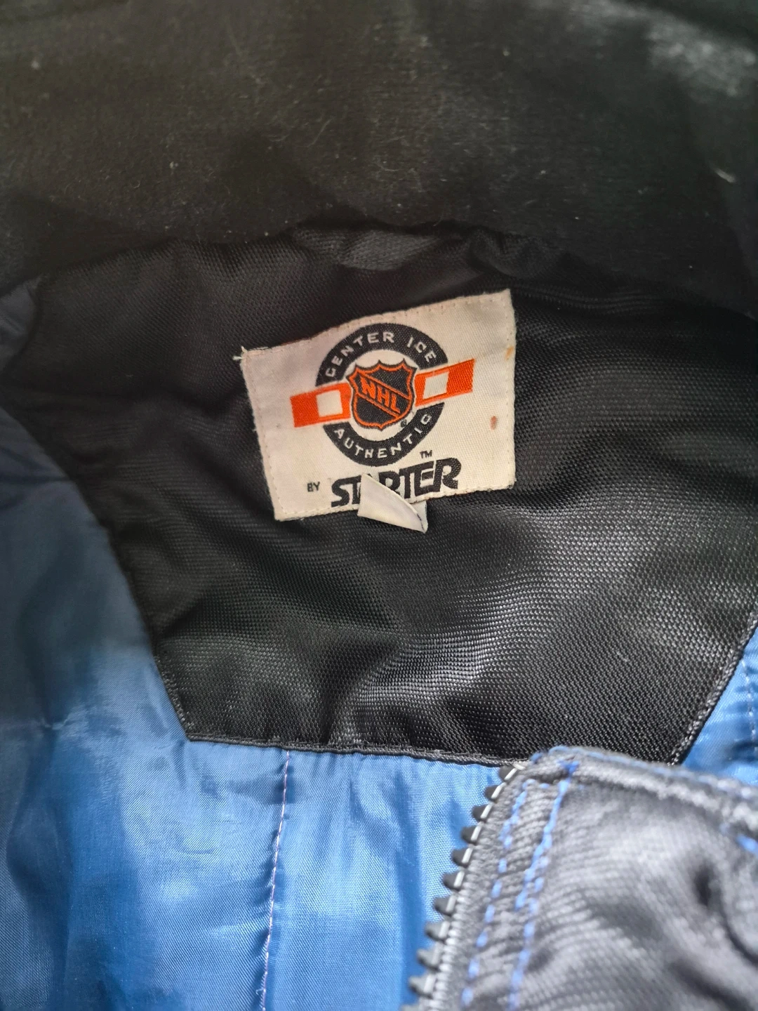 This is a Starter brand Toronto Maple Leafs jacket. It features the NHL Center Ice logo. The jacket has a blue and black design with the team's logo prominently displayed.