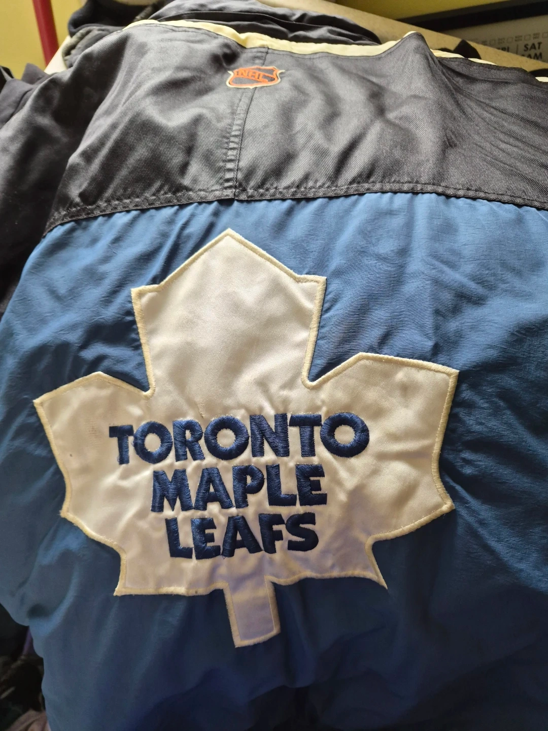 This is a Starter brand Toronto Maple Leafs jacket. It features the NHL Center Ice logo. The jacket has a blue and black design with the team's logo prominently displayed.