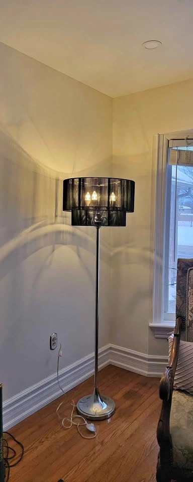 Stylish floor lamp featuring a unique double-layered black mesh shade and a high-polish chrome pole and base. Foot switch on cord. Lights up a room nicely. $90 or make an offer.
