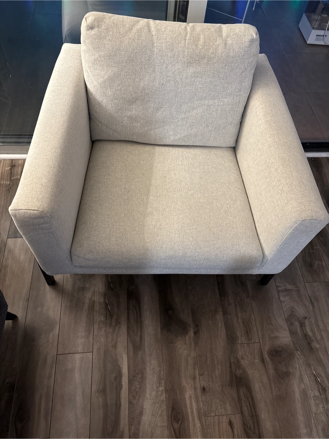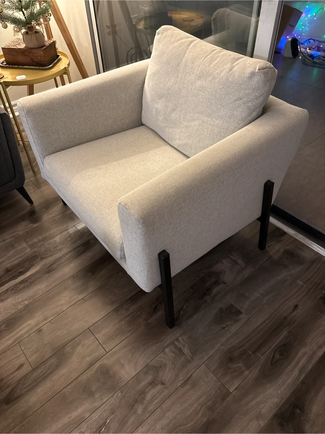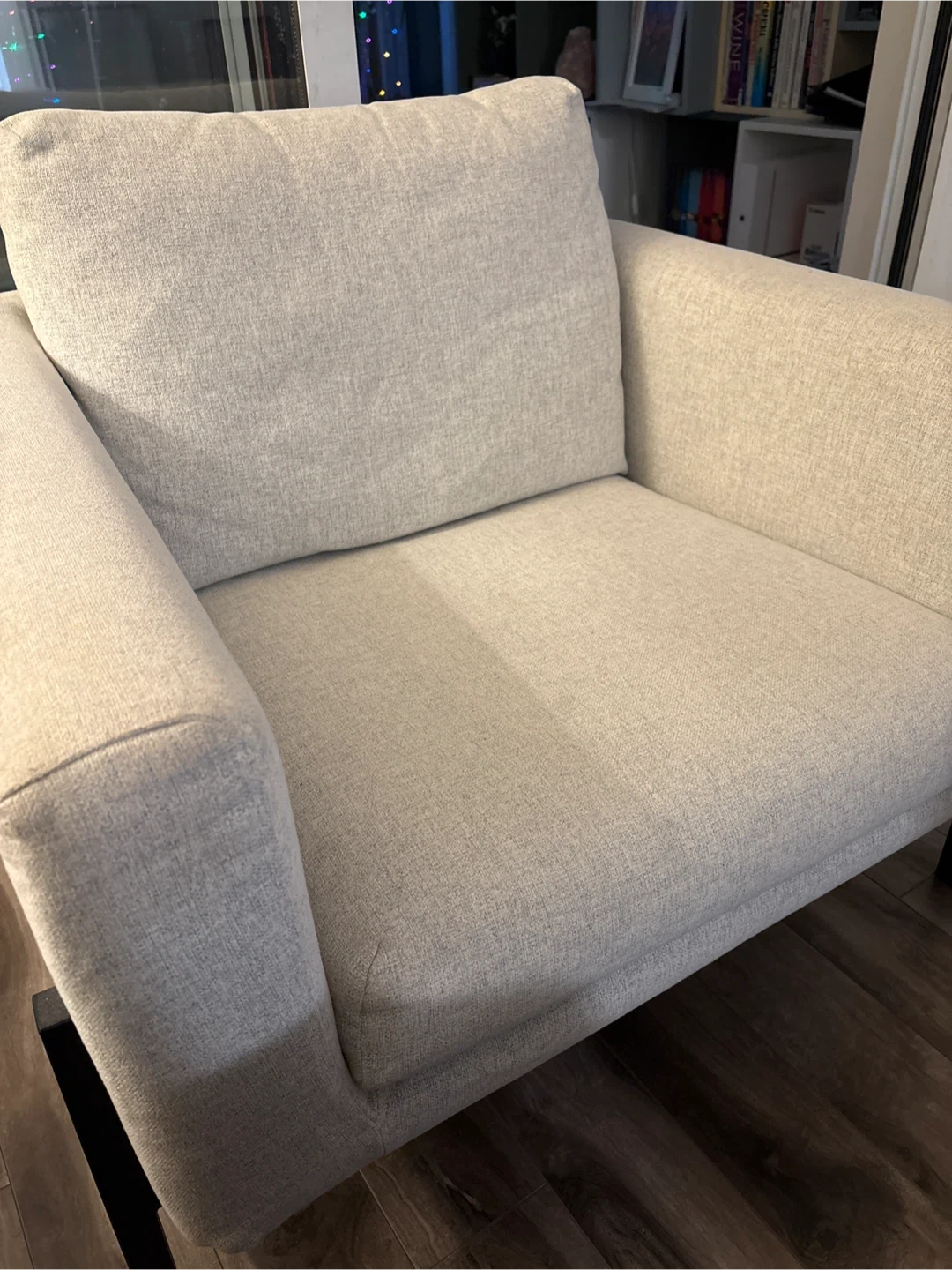 Selling a comfy beige armchair! It's in great shape and would be perfect as an accent chair in any living space. The neutral colour makes it easy to match with any decor.